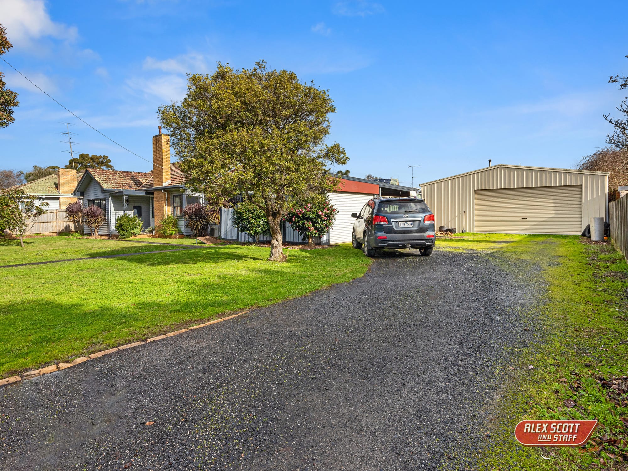 From the front, the home is situated to one side of the square block with a gravel driveway leading to the shed on the other side.