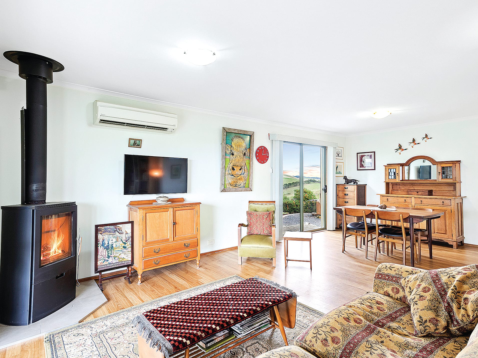 Year-round comfort is assured with a super-efficient wood heater, coupled with a large reverse cycle heating and cooling unit.