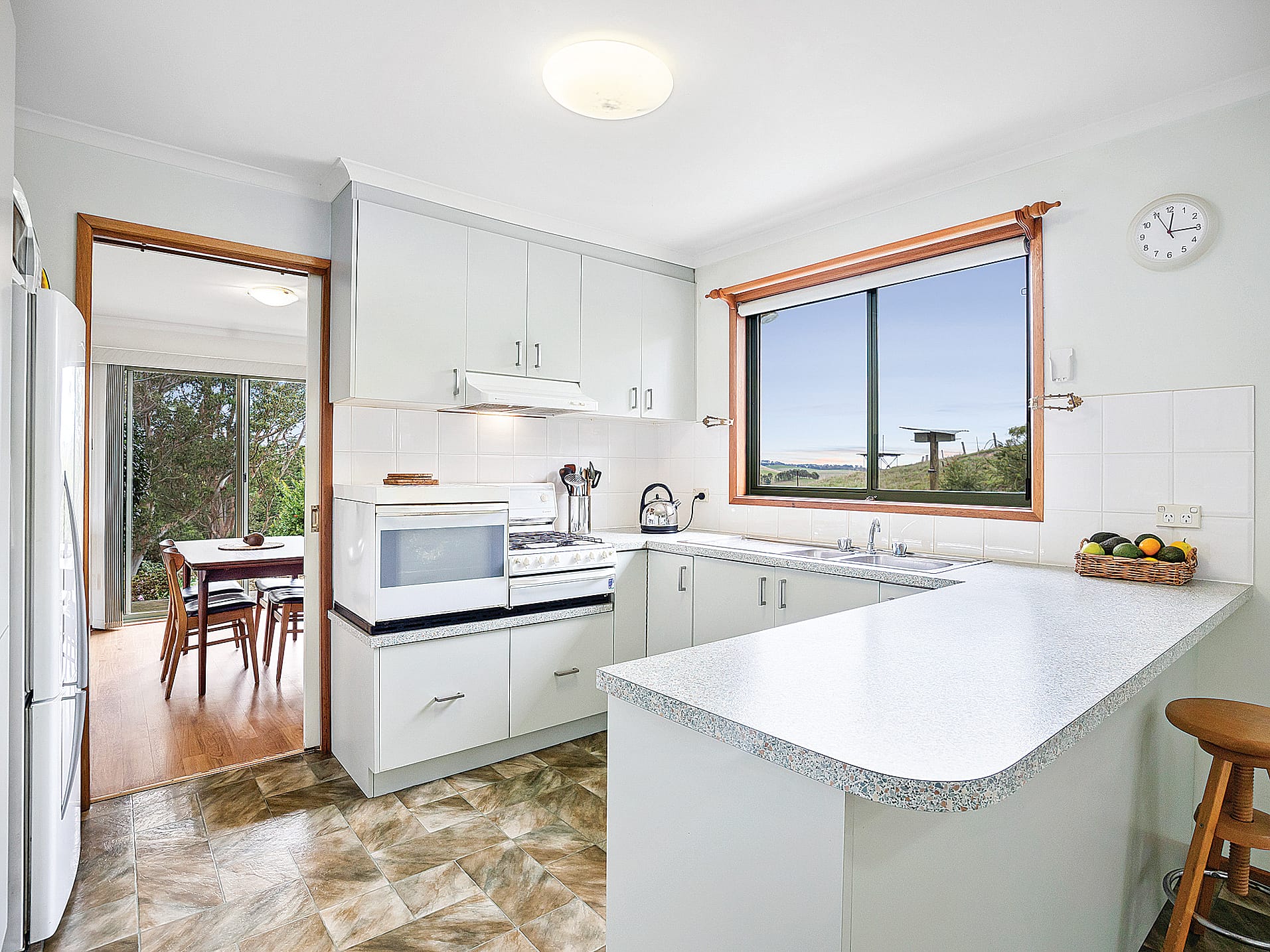 The light and bright kitchen is a picture in gleaming white, with a large breakfast bar to the adjoining meals area and doors out to the covered patio.