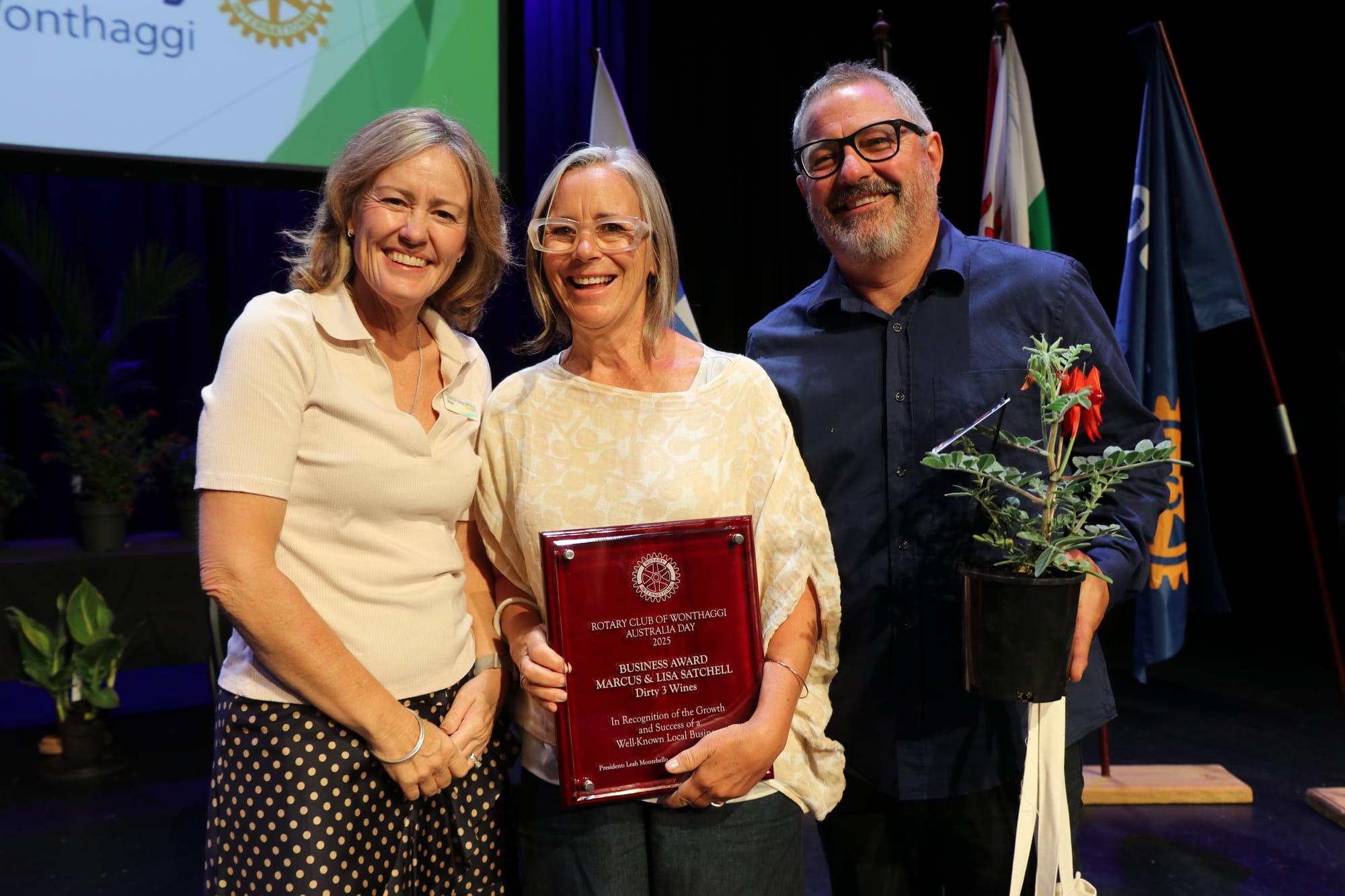 Rotarian Bill Street presented Dirty Three Wines owners Lisa Sartori and Marcus Satchell with the Business Award in recognition of the growth and success of a well-known local business. Speaking about their local upbringing in Wonthaggi and subsequent marriage before heading to Melbourne, Bill acknowledged their support of local organisations in training individuals through encouragement and nurturing, assisting others to develop their projects in the wine and hospitality industries.