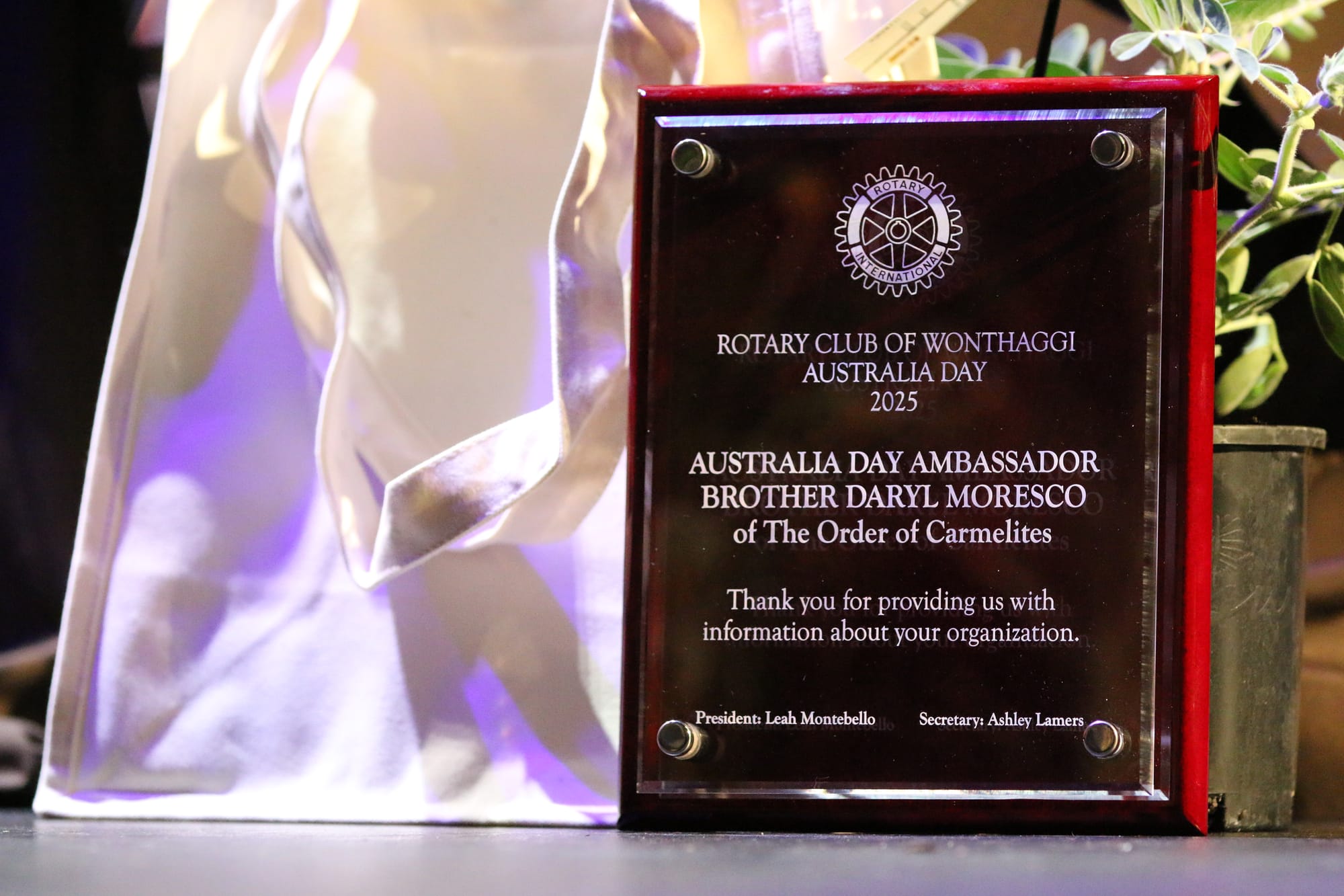Wonthaggi-born guest speaker and Rotary Club of Wonthaggi Australia Day Ambassador Brother Daryl Moresco of The Order of Carmelite spoke of his work in Australia and the USA, which like all those on stage today can only be described as tireless dedication.