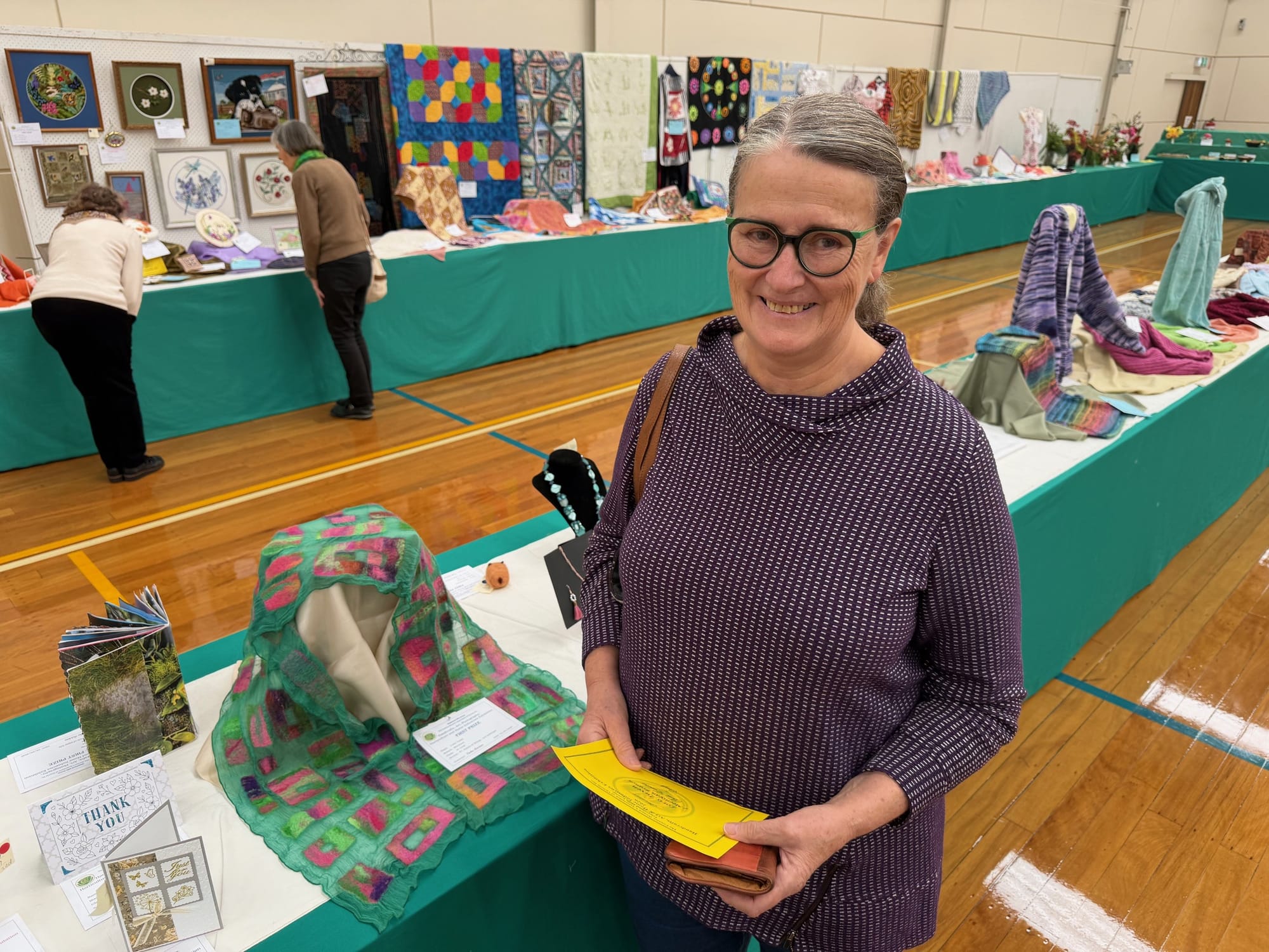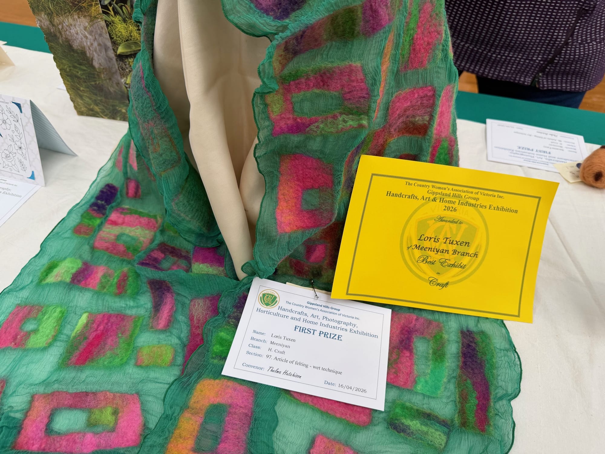 Loris Tuxen of the Meeniyan CWA Branch won the 'Best Exhibit in Craft' for this exquisite silk scarf with woolen felt features.