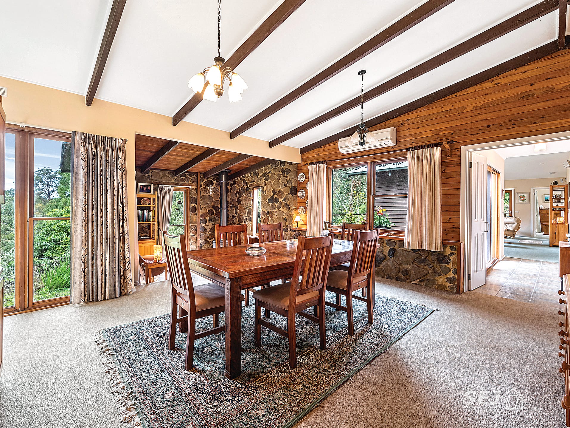 • Cathedral ceilings extend into the formal dining room with sunken lounge with featured rock walls and wood heater.
