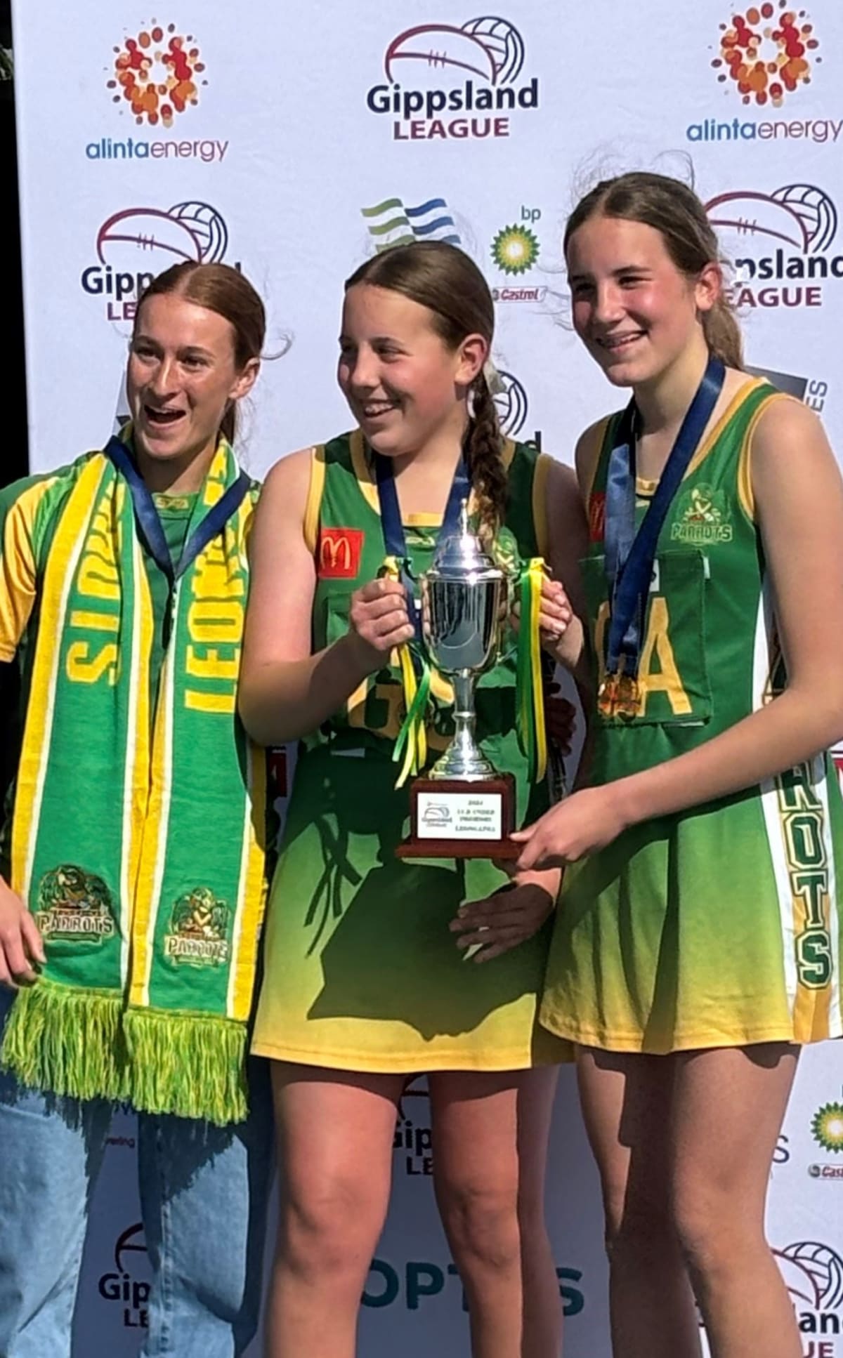 Winning Leongatha Under 13s captains and coach Jemma Rump, Ash Spark and Alicia Marshman are presented with the cup. GIPPSLAND League Grand Final Day had the best possible start for Leongatha with two netball wins, in the Under 13 and 17s, both...