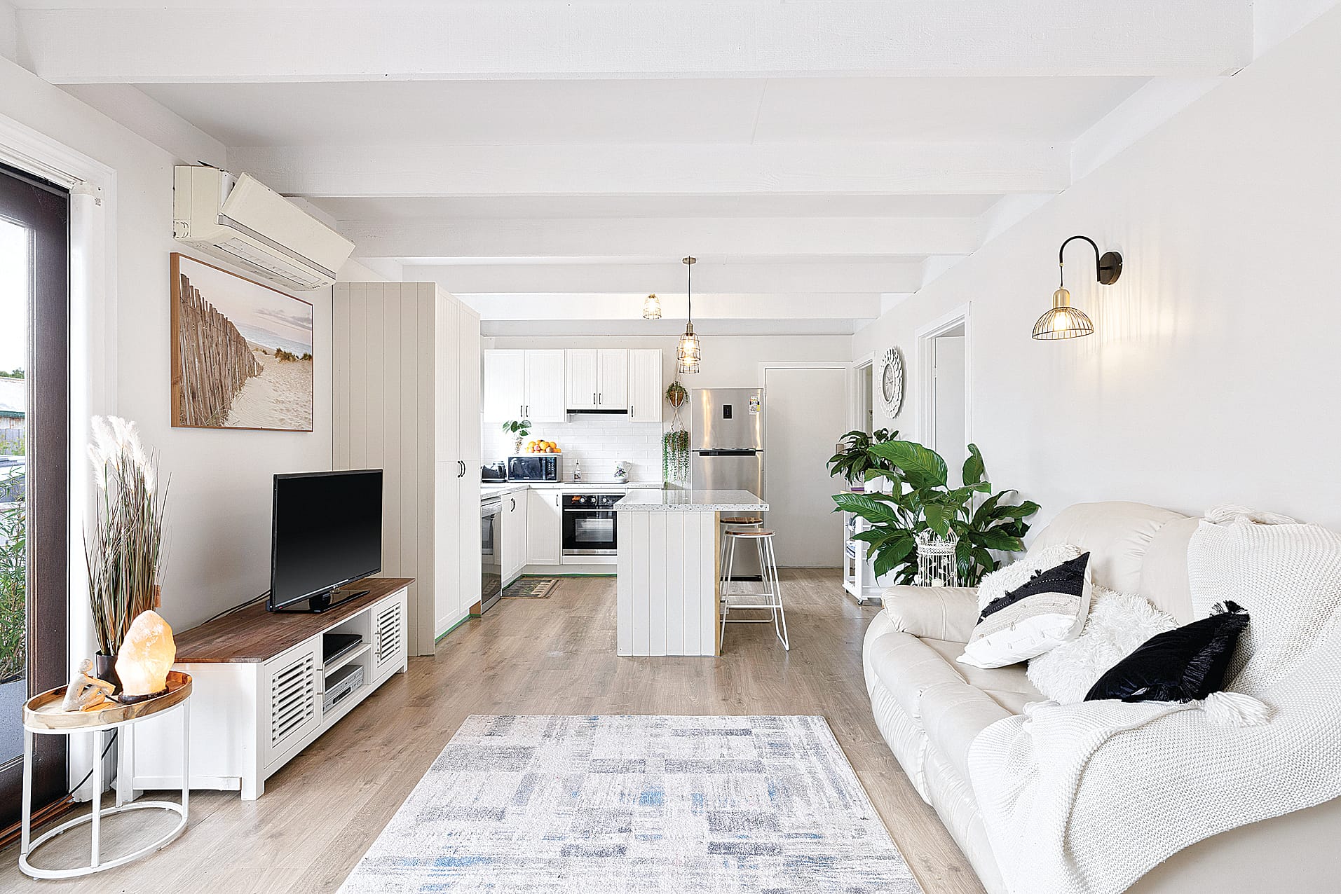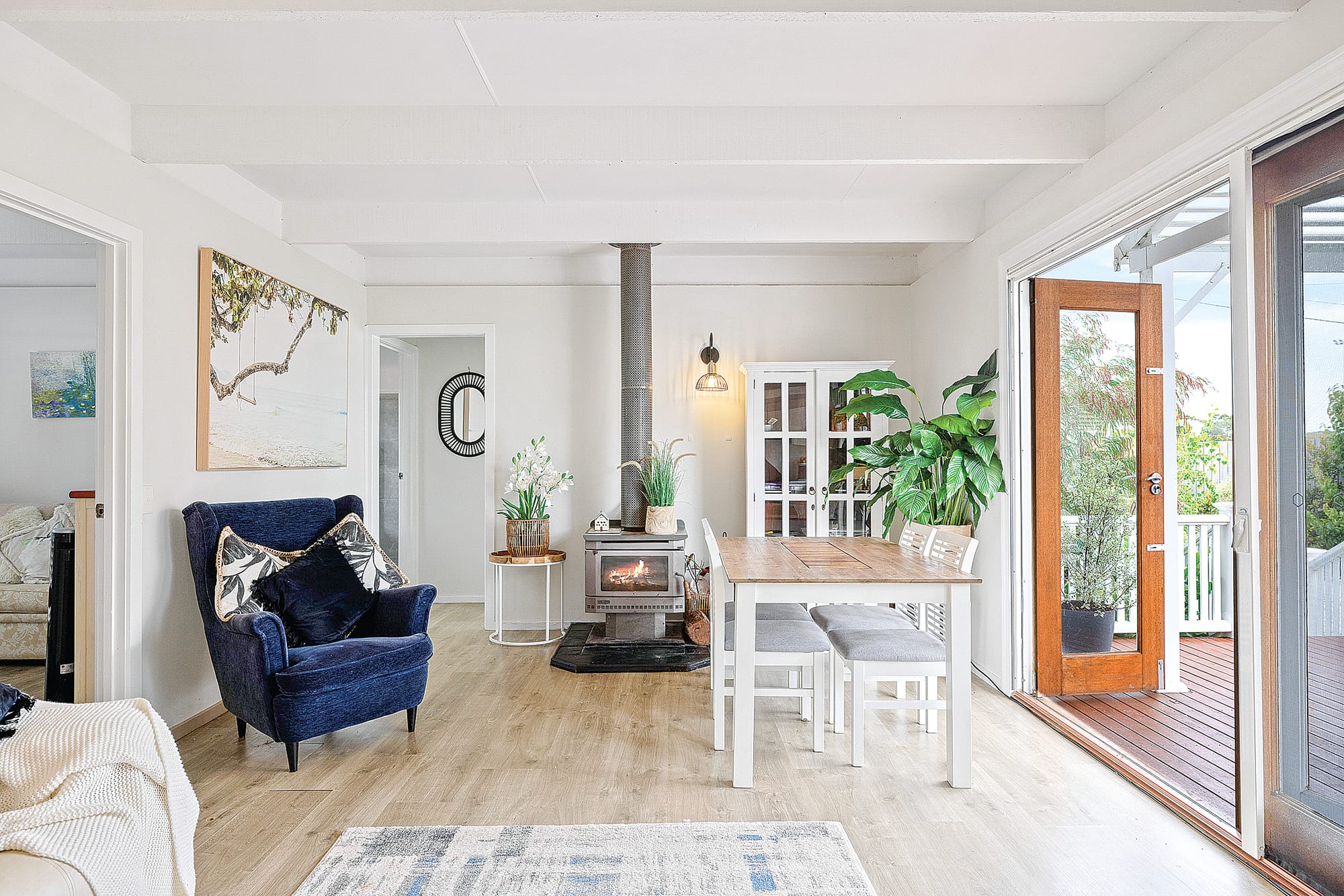 Step into a world of open plan living, where laminate floors grace every inch, creating a seamless and timeless aesthetic. The heart of the home features a wood heater and a split system, ensuring comfort year-round. The kitchen, a true masterpiece, boasts an induction cooktop, electric oven, and dishwasher, all seamlessly integrated into a transitional design that harmonizes classic charm with modern convenience.