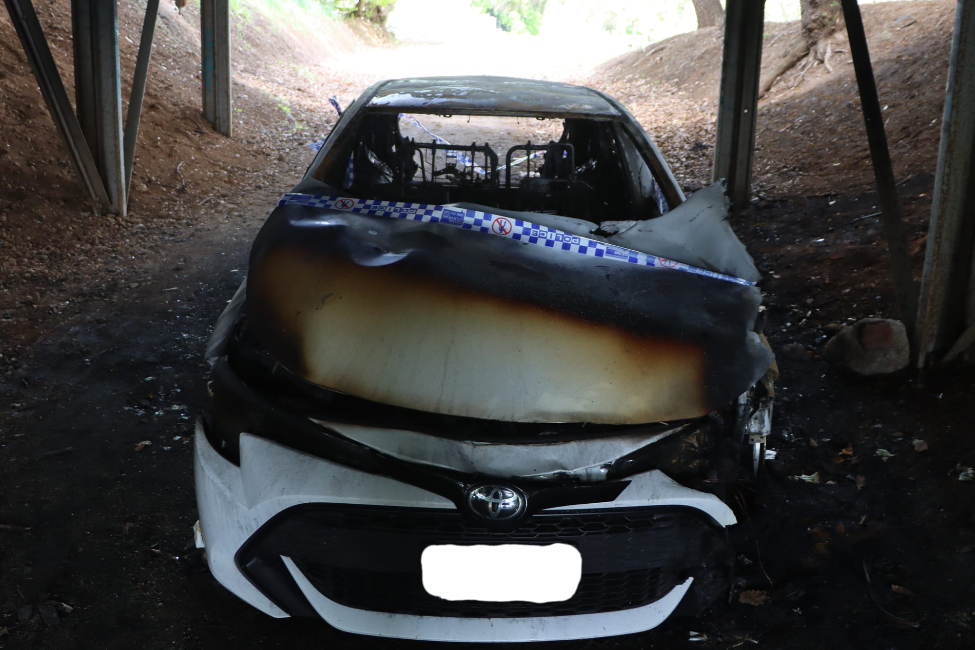 The first vehicle a 2019 white Toyota Corolla stolen during a home invasion in Leongatha was recovered burnt out on the rail trail at 4am this morning (October 1).