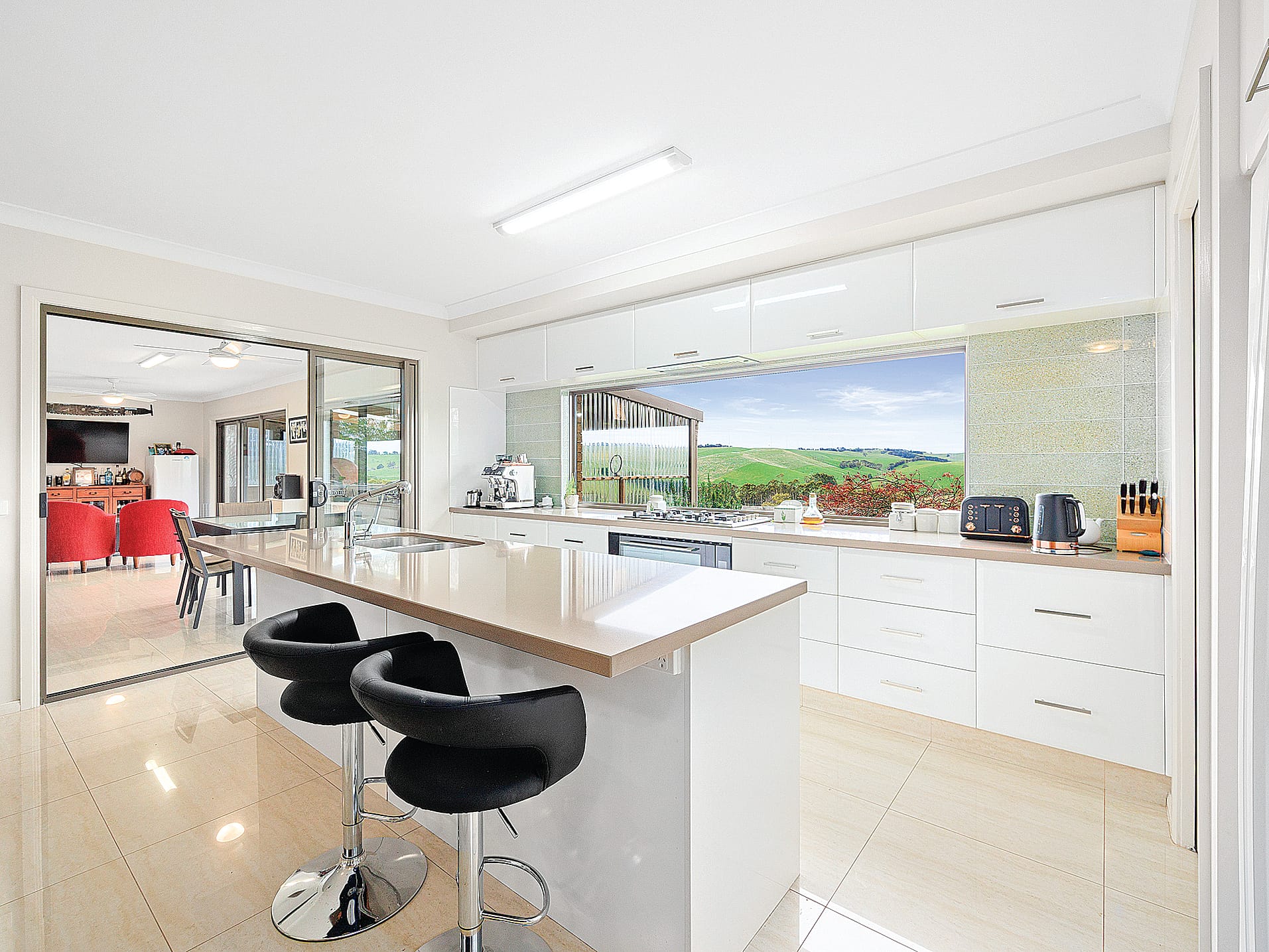 With space for the largest of gatherings, centering around the superbly appointed chef’s kitchen with huge stone island bench, 900mm gas hob with fan forced under bench oven, dishwasher and spacious walk in pantry – the main feature of the kitchen is the incredible highlight window taking in the amazing view.