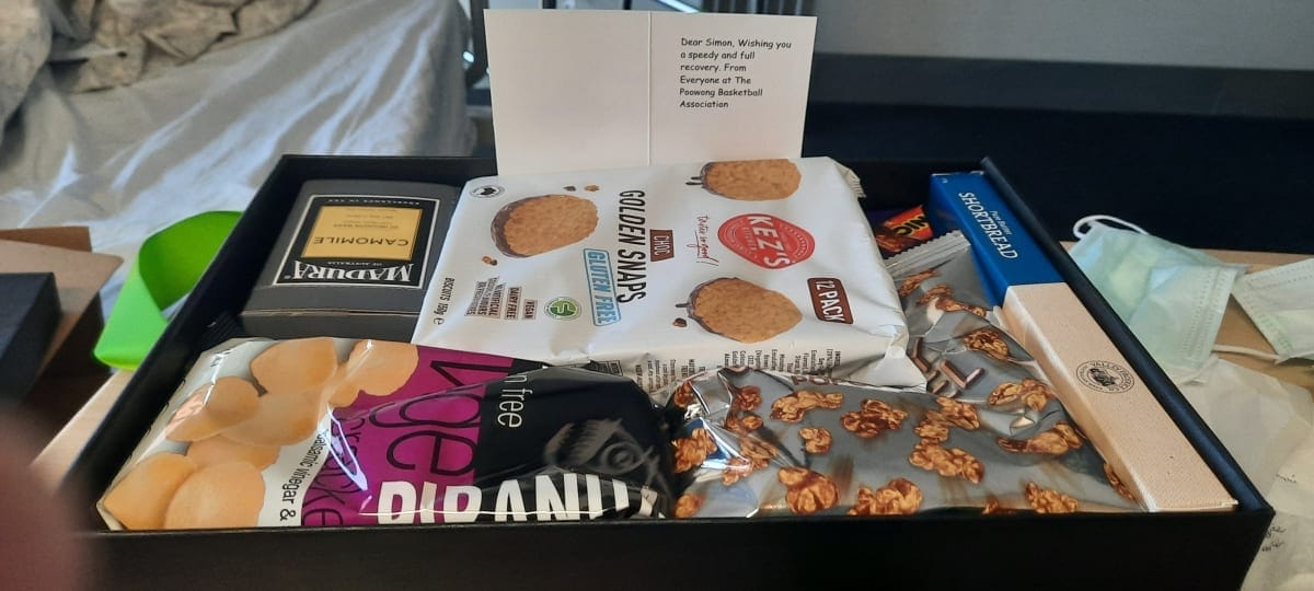 On June 29, 2022, Simon Patterson posted a thank you note to the Poowong and District Amateur Basketball Association, with whom he has played and volunteers as a junior coach, after the group sent him a care package during his long stay in hospital, as follows: