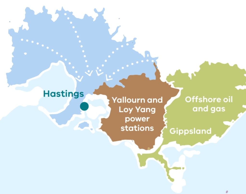 • How does the Latrobe Valley and Sale which are seeing transition out of coal, oil and gas benefit if Hastings is to be the hub for offshore wind?