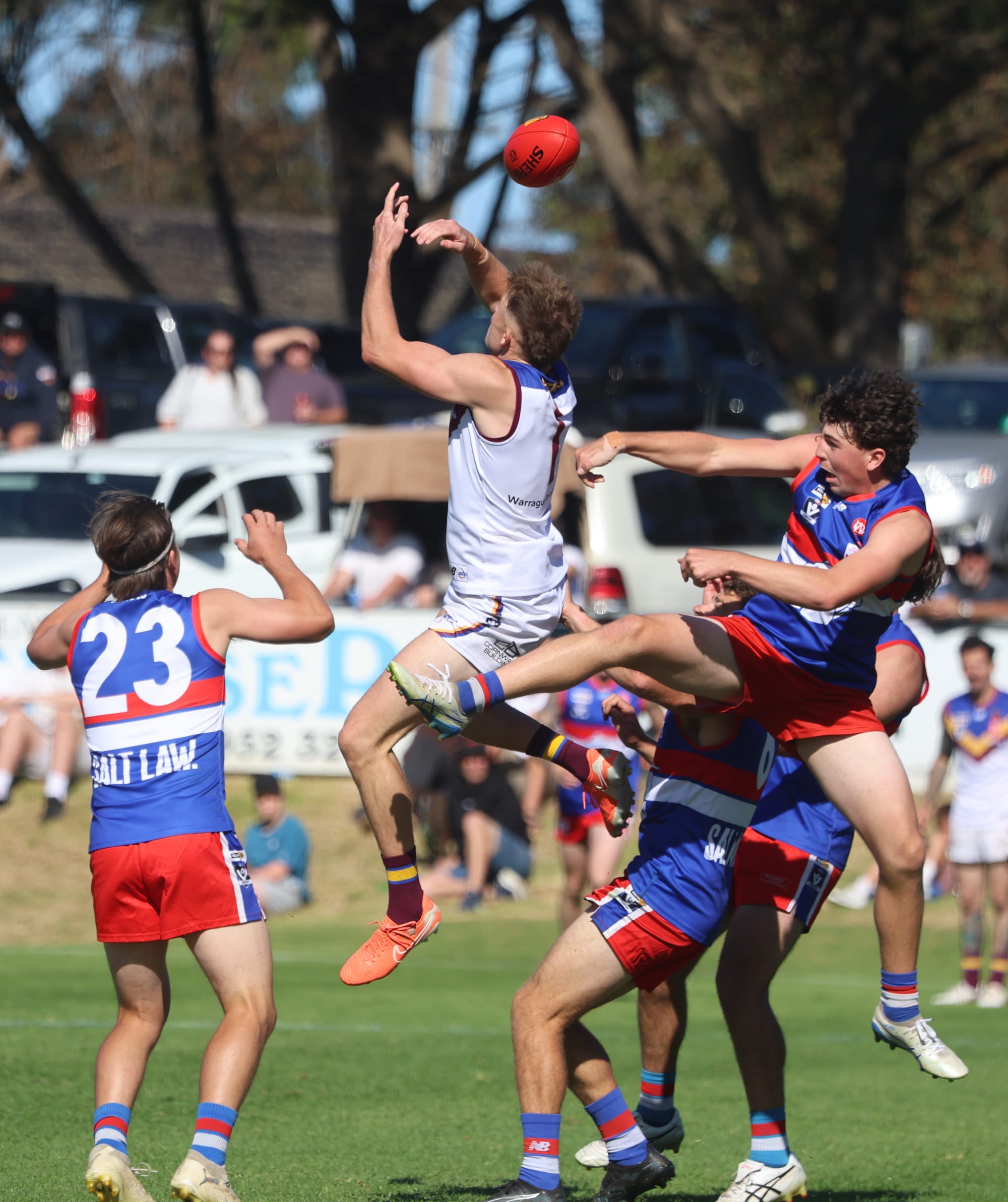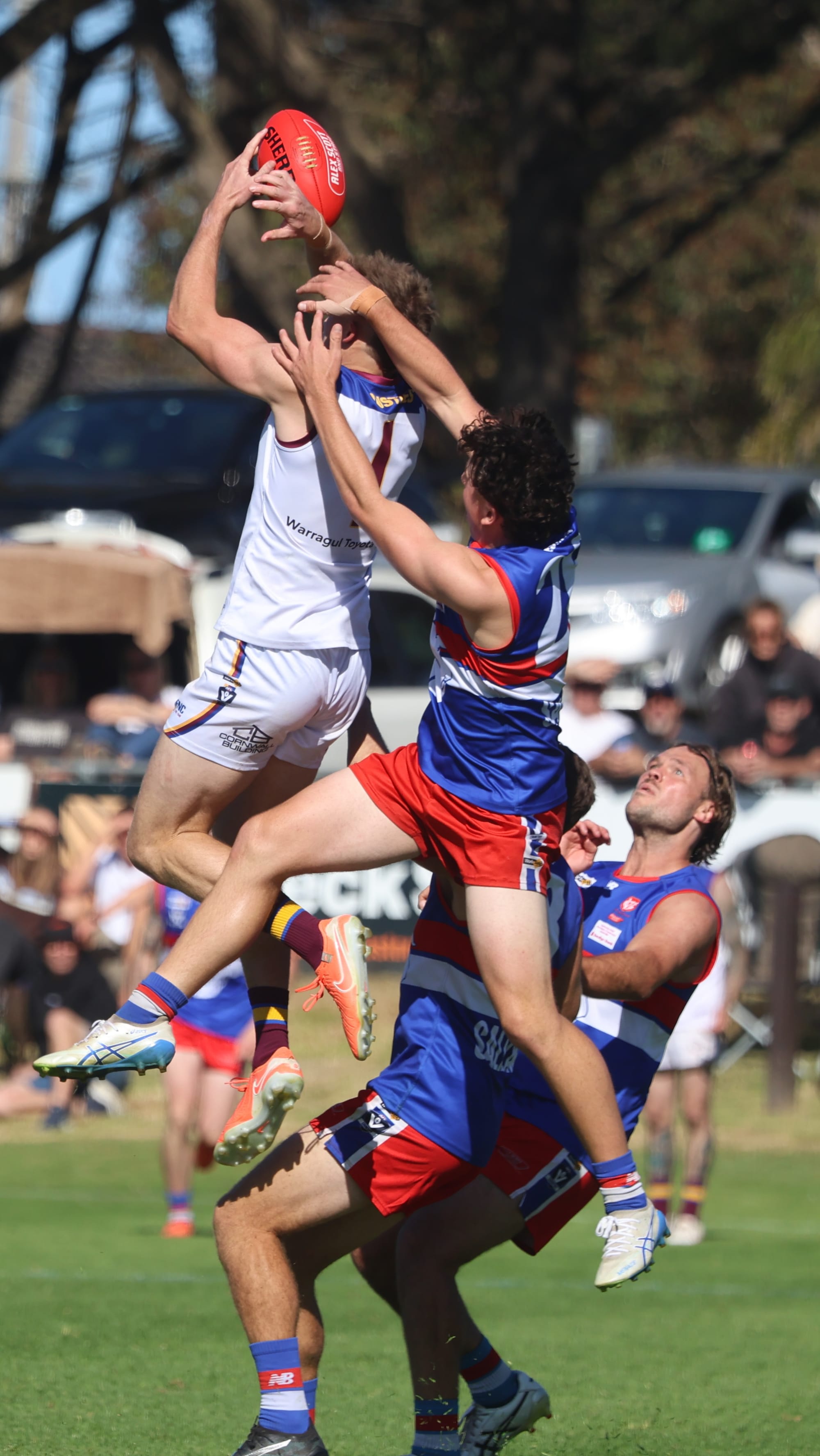 Warragul Industrials' player Lachlan Bambridge rises high above the pack before being awarded this contender for 'mark of the year before calmly popping it through for a goal.