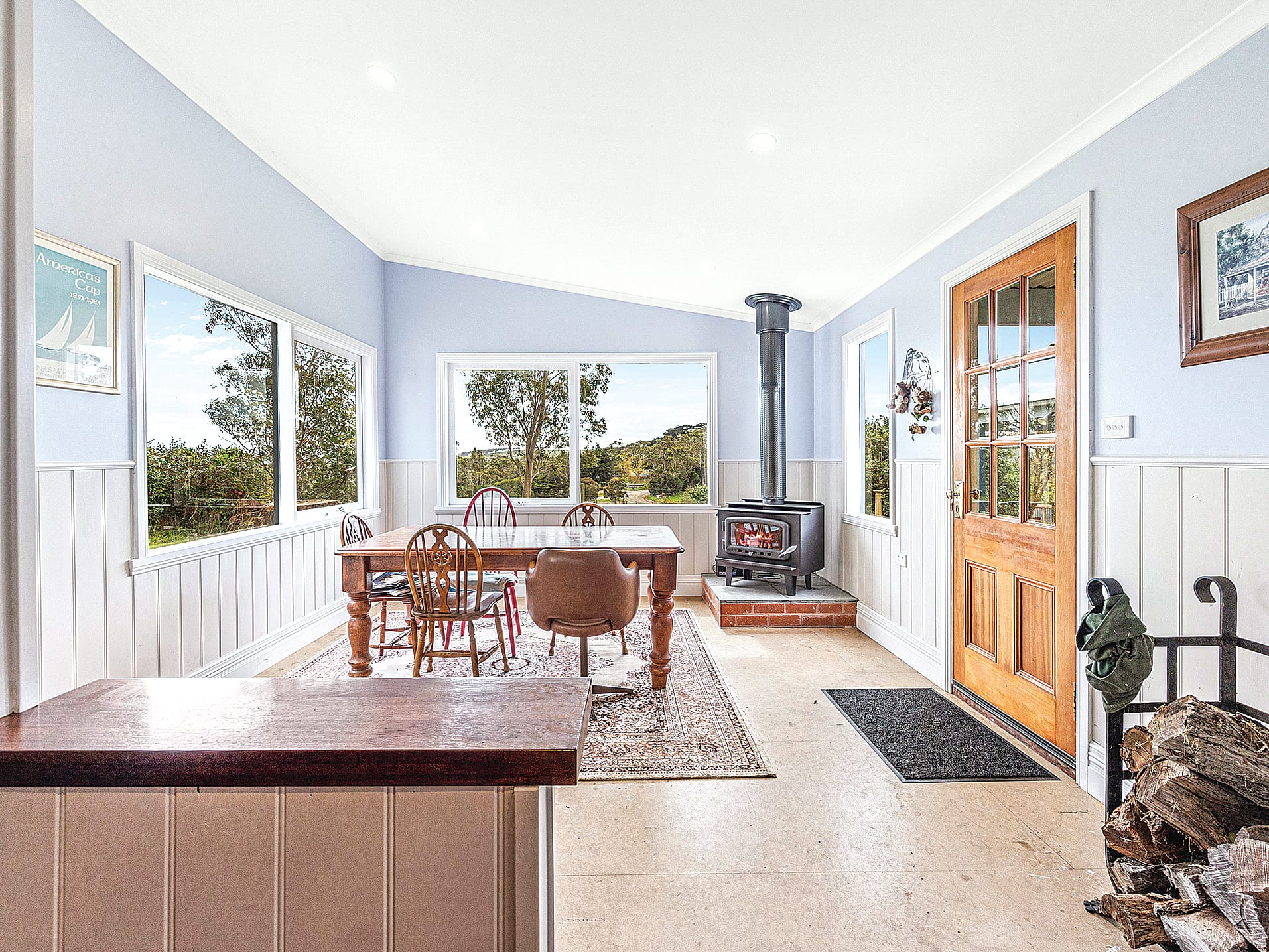 Rebuilt from the ground up with a craftsman’s eye for detail and no expense spared, the character filled main residence is packed with period charm. Magnificent ‘Sydney Bluegum’ polished timber flooring features throughout, along with dado panelling, high ceilings, original fireplaces, restored windows and French doors. Filled with light and sited to capture the outlook from every window, the breakfast spot is the perfect entry to the home. A farmhouse kitchen with ‘Rayburn’ wood stove and country style cabinetry adjoins.