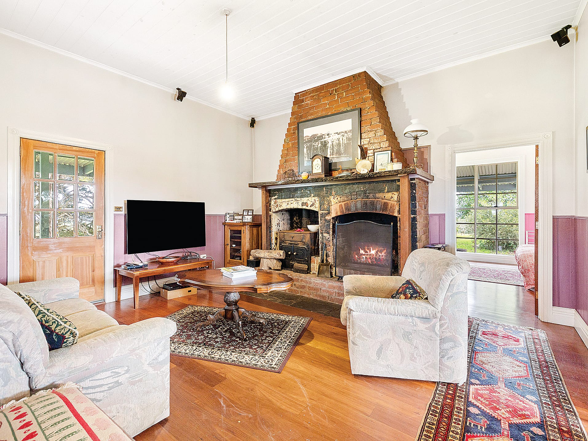 Sited in the centre of the home is the generous living room set around the original double hearth with huge chimney, housing both a combustion heater and open fireplace. French doors open to the formal dining room, again north facing to capture spectacular views and natural light. There are two bedrooms plus a large room which can be used as either further bedroom accommodation or as a games room. The period style bathroom includes the laundry facilities and there is a powder room outside.