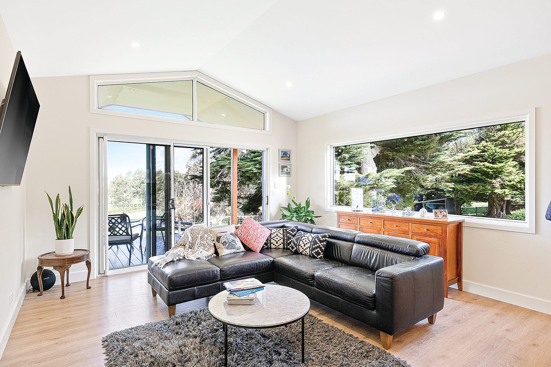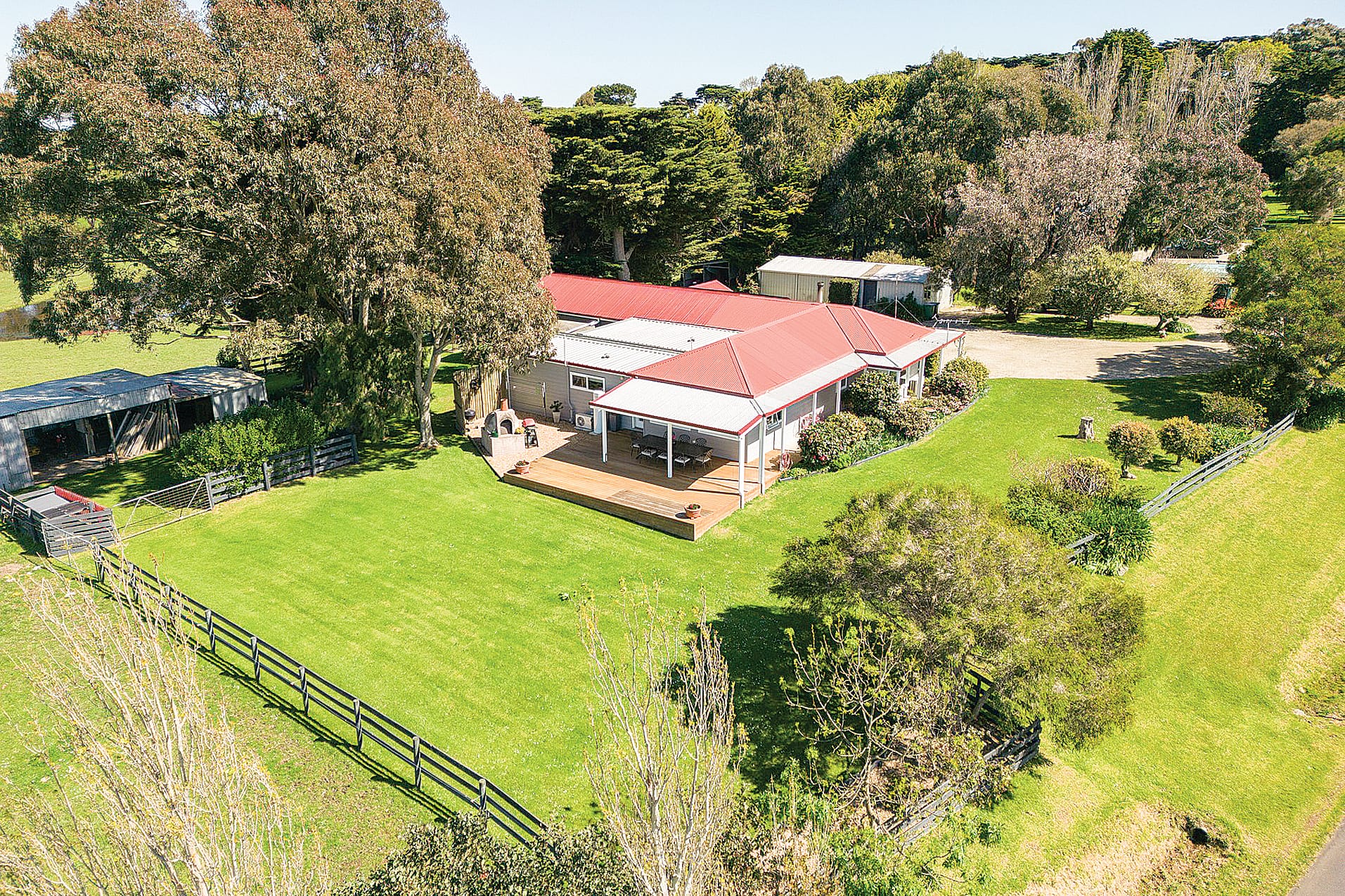 Effortlessly extending from the kitchen is the inviting living area, featuring sliding doors that open onto a spacious deck with breathtaking views of the expansive property. The raked ceilings and floating floors add an extra layer of elegance to this space, and a split system offers all round comfort.