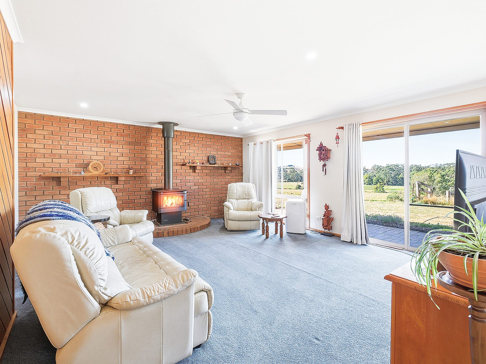 The blackwood timber kitchen is equipped with a gas cooktop, electric wall oven and dishwasher, while a light-filled open-plan dining area flows seamlessly into a separate lounge warmed by a wood heater.