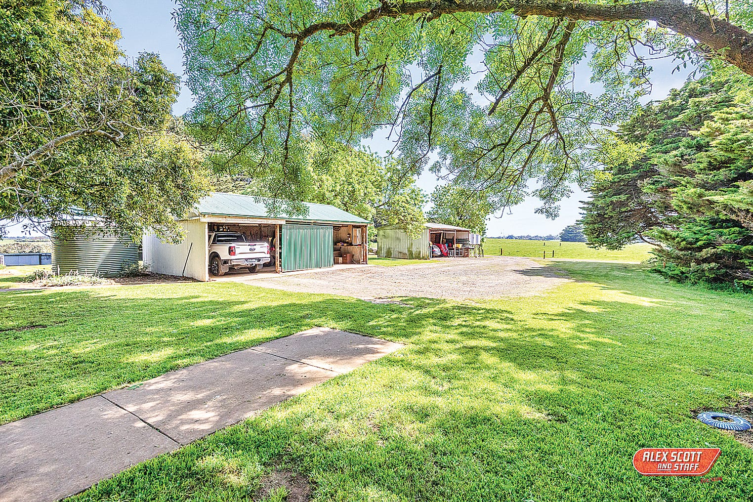 The house yard has a three-car garage and an adjoining three bay machinery shed.