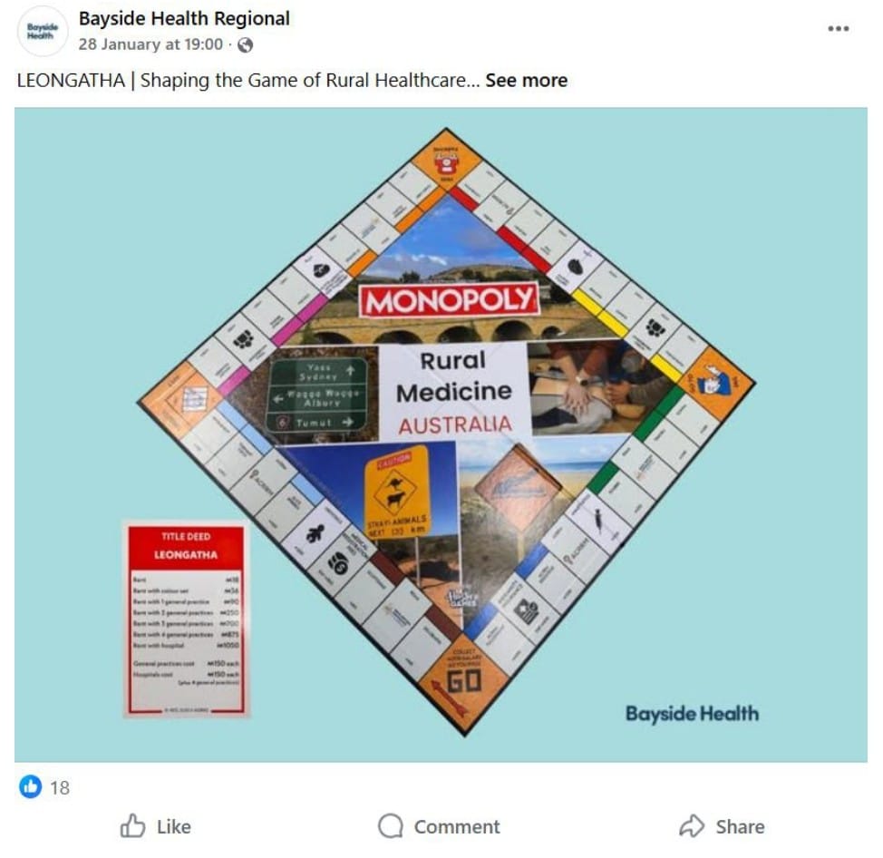 “Leongatha, shaping the game of rural healthcare, some places are landmarks, others shape the game. Of all rural health services across Australia, Leongatha made the Monopoly board,” says Bayside Regional Health in its cryptic message while posting a photo of the medicine Monopoly board on Facebook and Instagram.