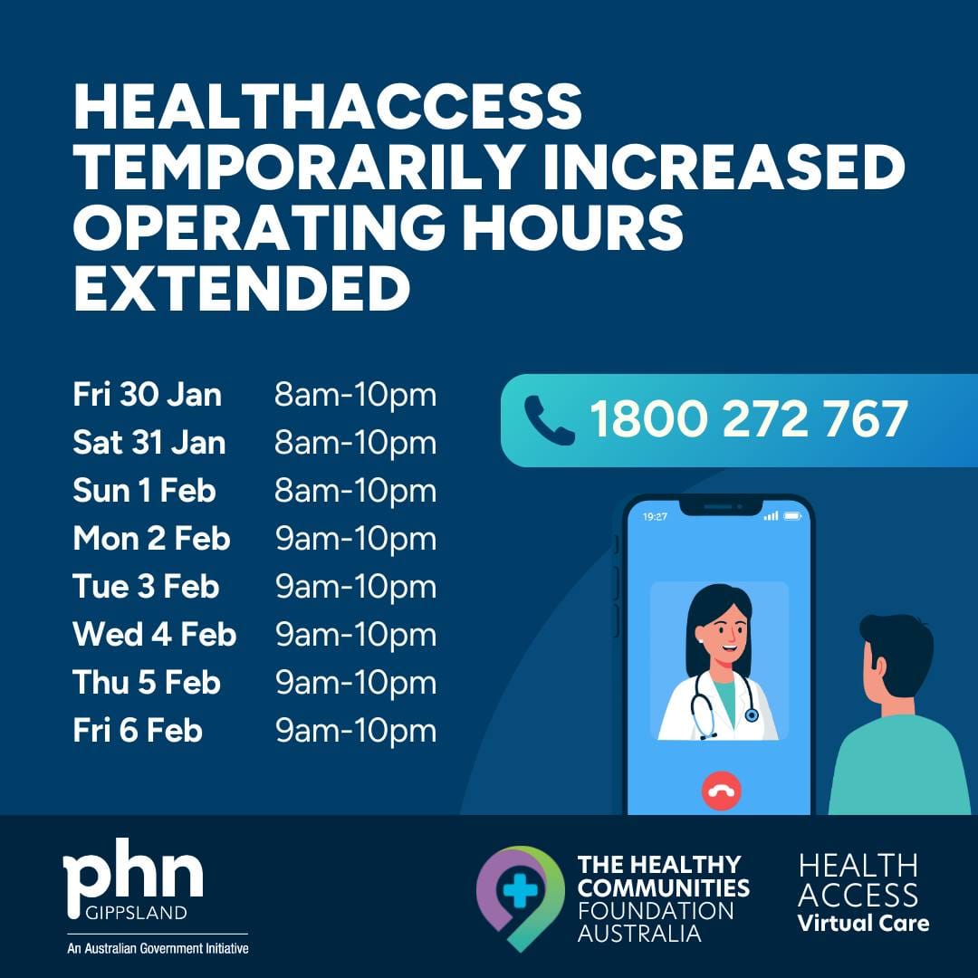 “HealthAccess after-hours GP telehealth will continue providing extended hours over the next week, through to Friday, February 6, 2026.