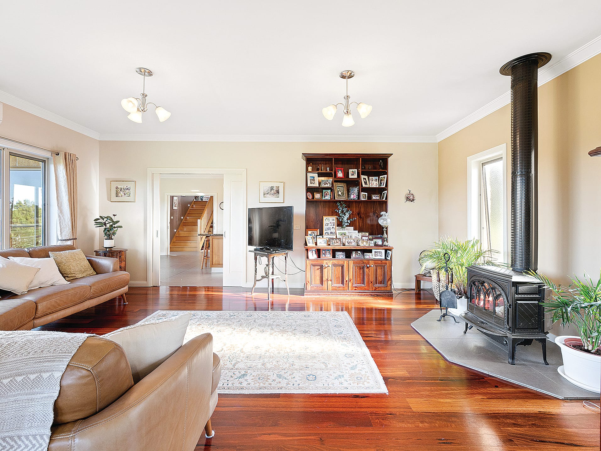 Light filled living room with stylish Jotul wood heater. Superbly appointed central kitchen with rich timber cabinetry, stainless steel appliances and a large breakfast bar to the dining room. Master bedroom with walk in robe and ensuite bathroom plus a light filled home office or fourth bedroom with perfectly placed picture windows. Upstairs to a spacious family room with raked ceilings, extensive glazing and balcony with pastoral views. Two further fitted bedrooms are serviced by a central family bathroom.