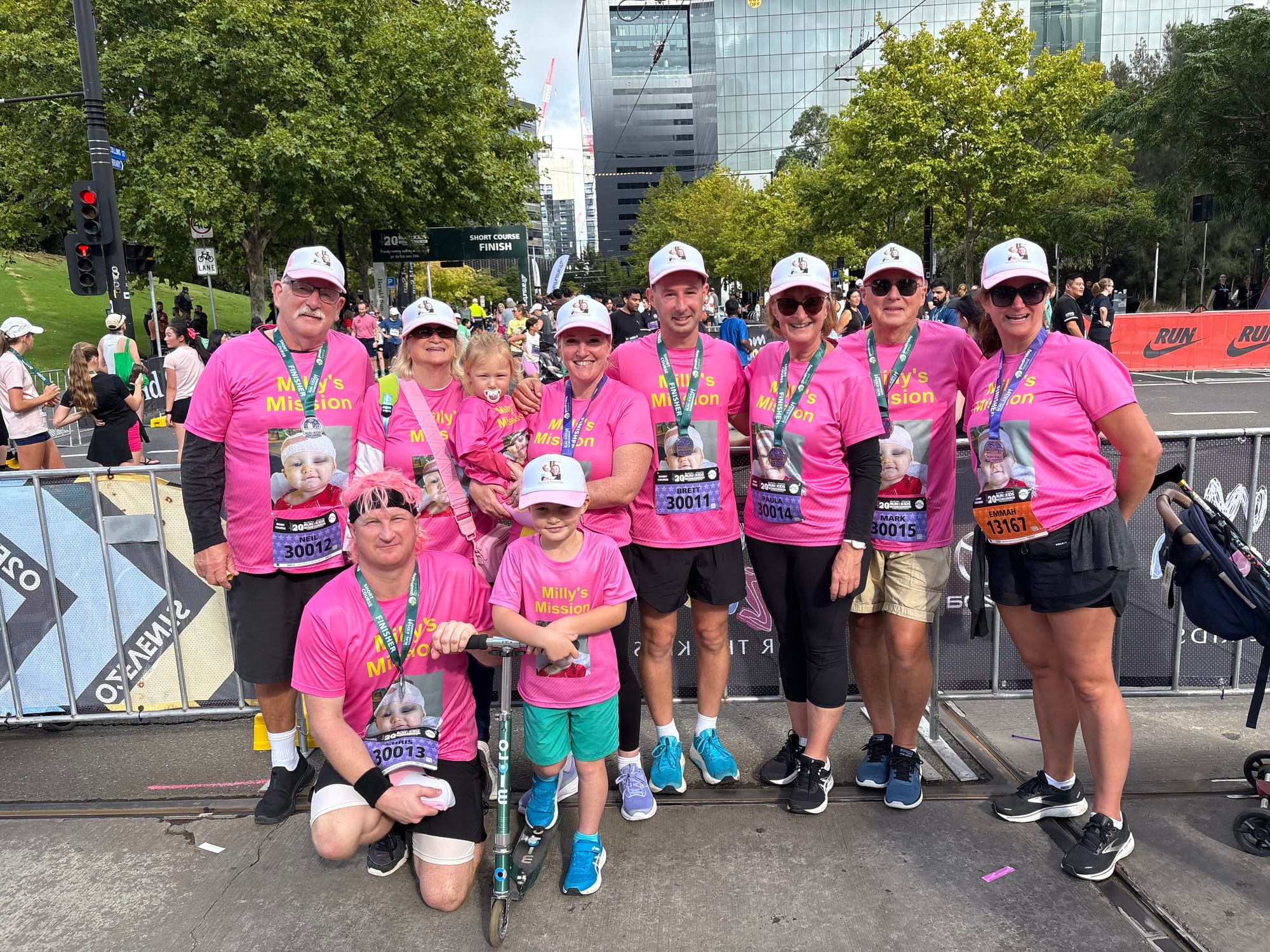 The youngster who inspired the creation of Milly’s Mission experienced the 5km journey from her pram, with both her grandfathers crossing the finish line with her.