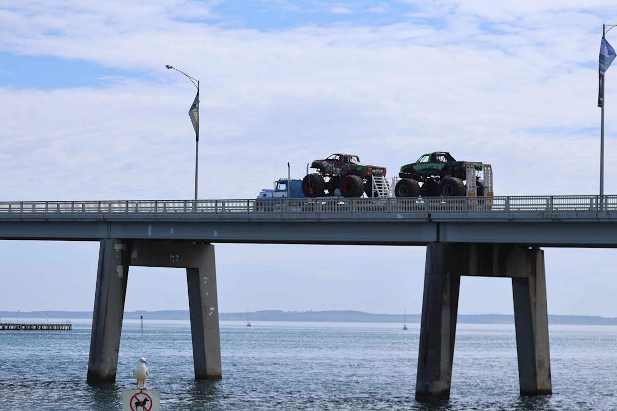 And crossing the San Remo Bridge on to Phillip Island on Wednesday this week were two of the stars of one of the many forms of off-track entertainment – the Monster Trucks.