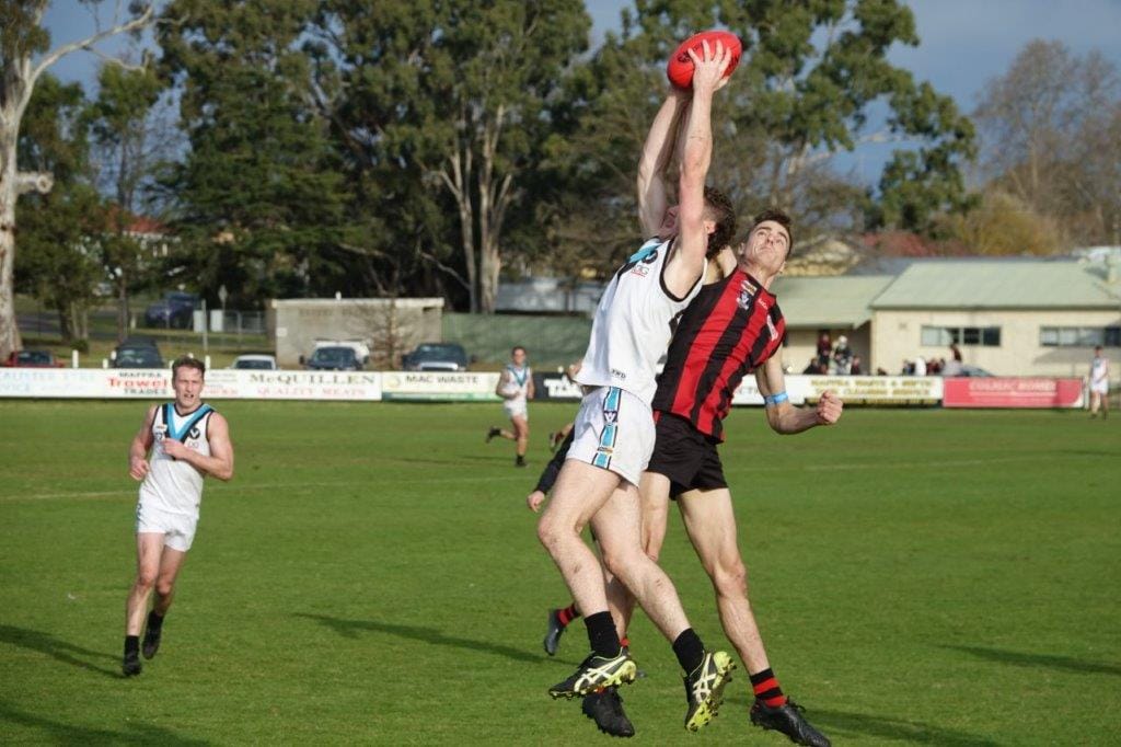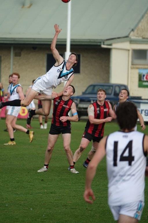 Two terrific ruckmen, Wonthaggi’s Toma Huther (32 hit-outs, 15 possessions) in a ding-dong battle with Maffra legend Will Pleming (24 hit-outs).