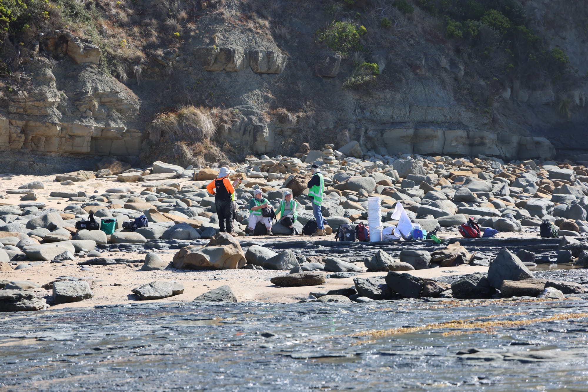 Crew members have been climbing down to the beach at Twin Reefs looking for the remains of the creatures that lived there 126 million years ago. So far this year, they have found many bones and a beautiful shiny tooth from an Australian ornithopod dinosaur.