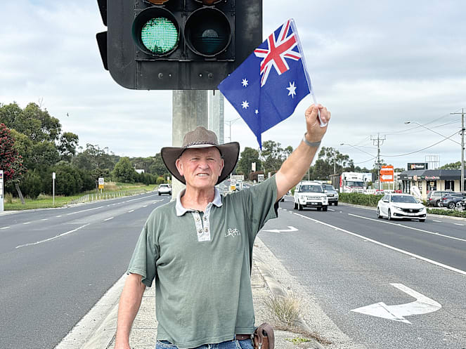 IN A ONE-man demonstration against “wokeism” Chris Nagle is waving the Australian flag at the Grantville traffic lights for eight hours today.