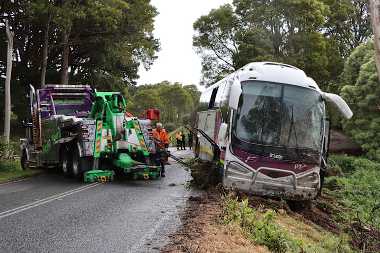The VLine 9.02am coach from Southern Cross to Yarram was left balancing precariously over the edge of the road reserve between trees, needing an additional salvage truck to stabilise the vehicle so that it could be safely recovered.