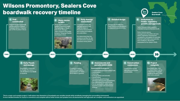 “During 2021, successive storms and floods hit the Prom and caused significant and widespread damage. This included to the Sealers Cove Boardwalk, which provides a connection to the Tidal River visitor hub across an otherwise impassable swamp.
