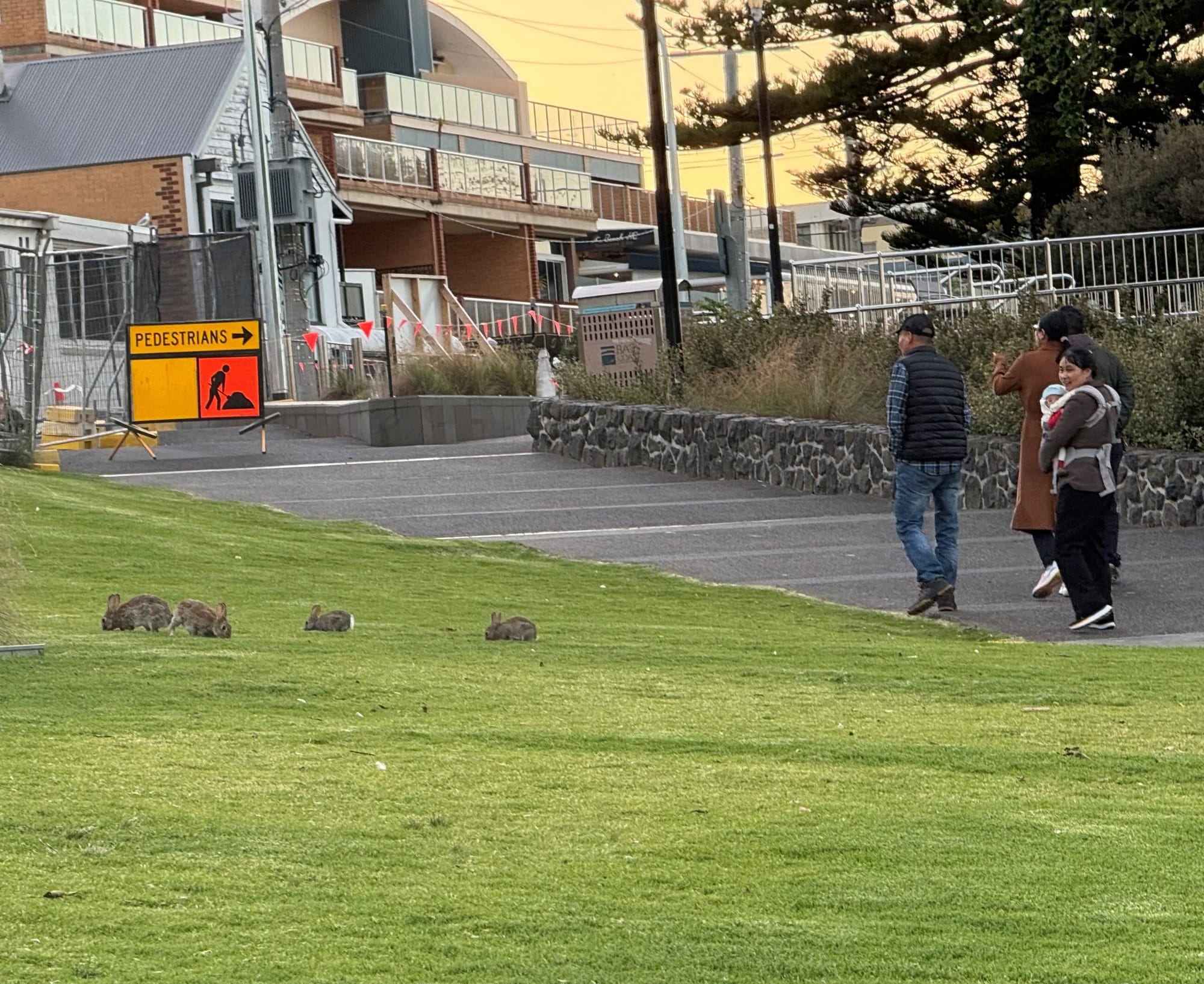 The “unfolding catastrophe”, as Cr Tim O’Brien termed it, has even become something of a tourist attraction as visitors, pulling up in their buses for a bit of R&R before heading out to the penguins at dusk, admire the cute and fluffy bunnies, munching away on the lawns at the end of Thompson Avenue.