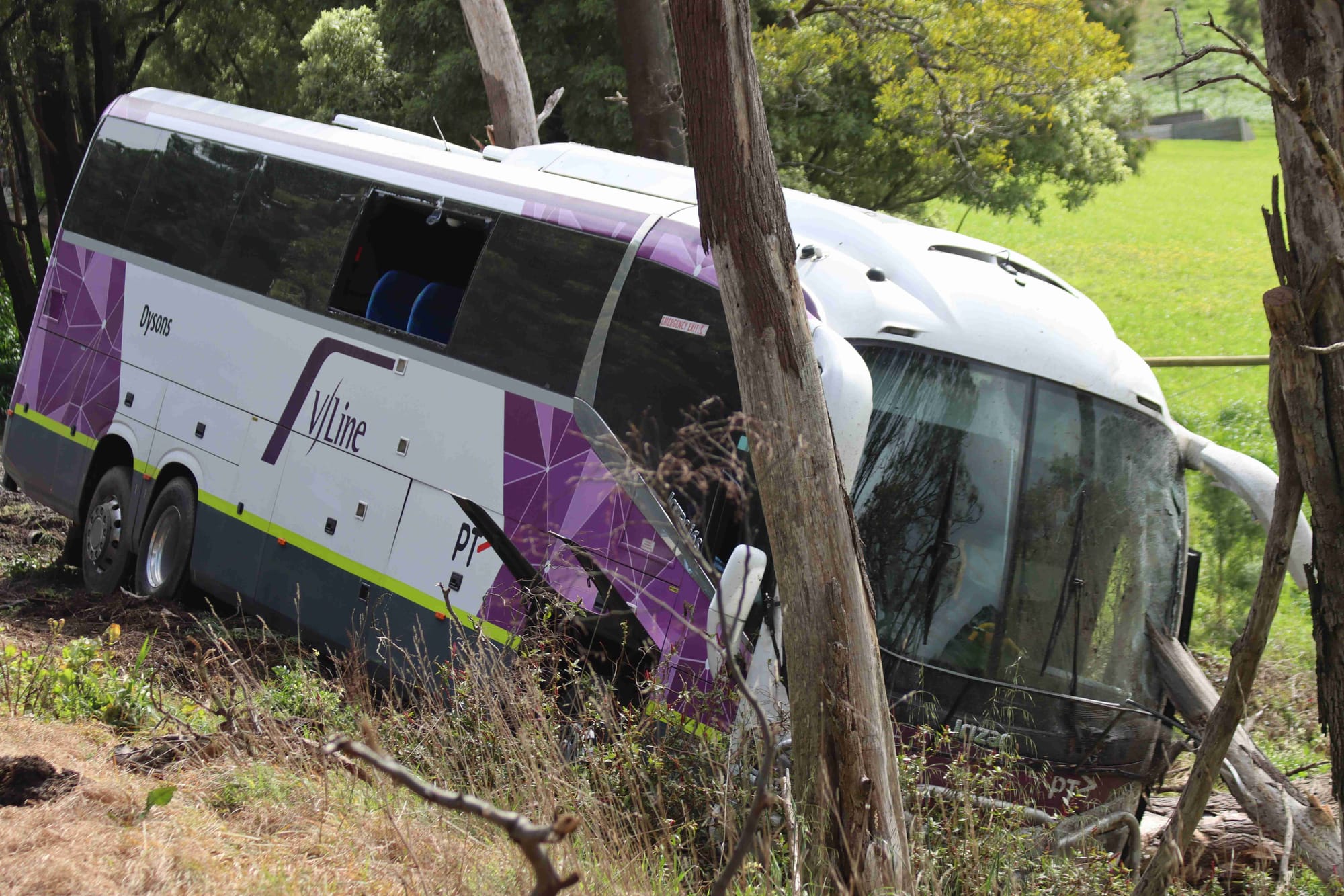 The VLine 9.02am coach from Southern Cross to Yarram was left balancing precariously over the edge of the road reserve between trees, needing an additional salvage truck to stabilise the vehicle so that it could be safely recovered.