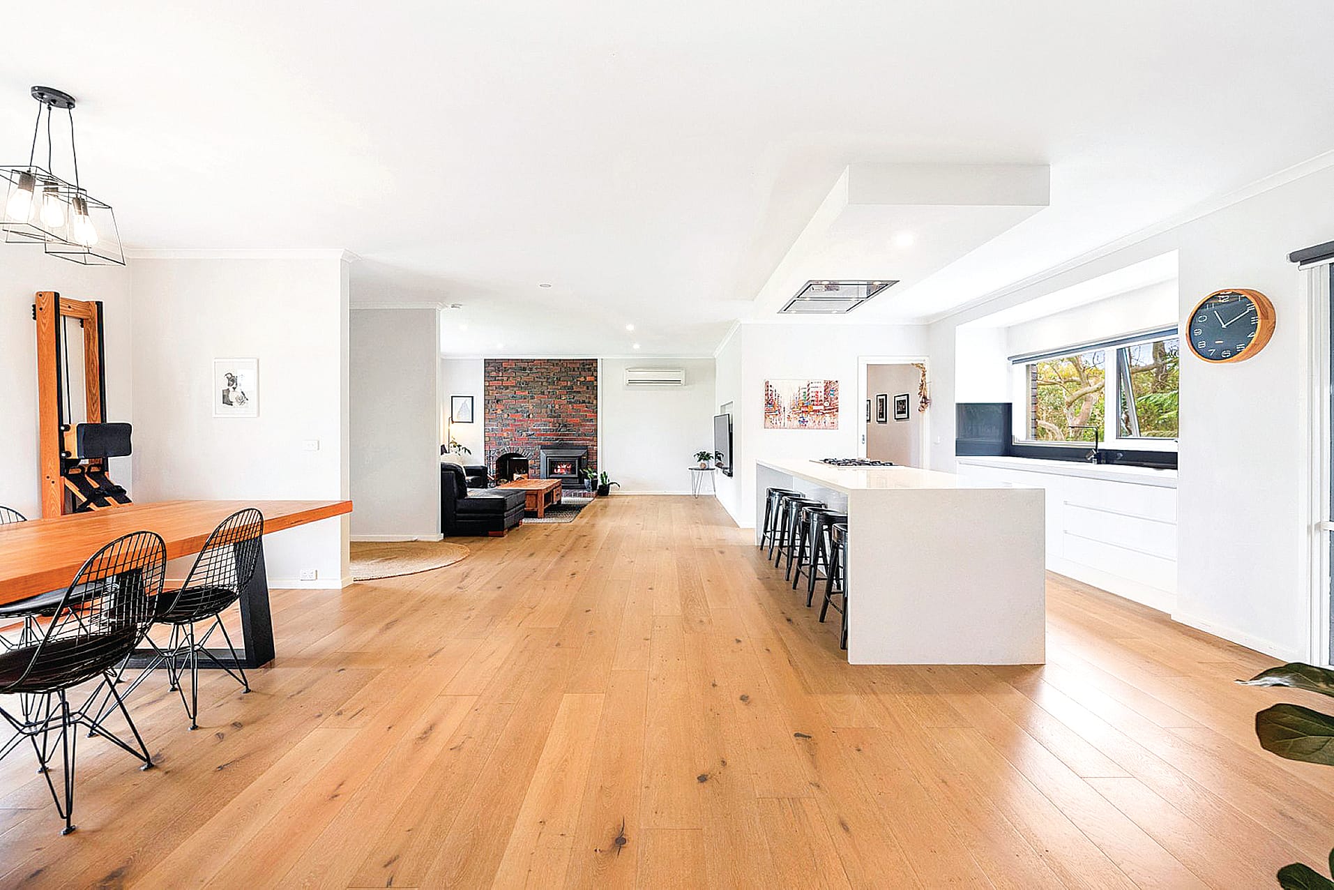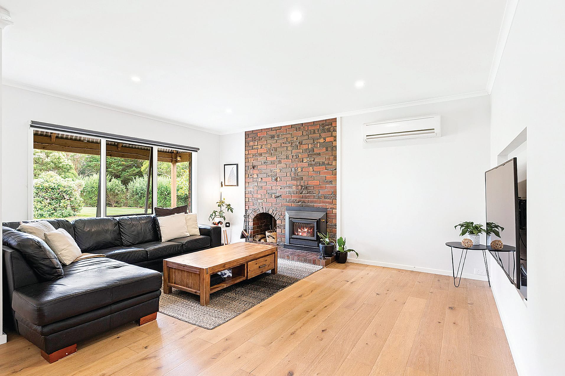 The spacious living and dining areas feature timber laminate flooring, reverse cycle air conditioning and solid fuel heating.
