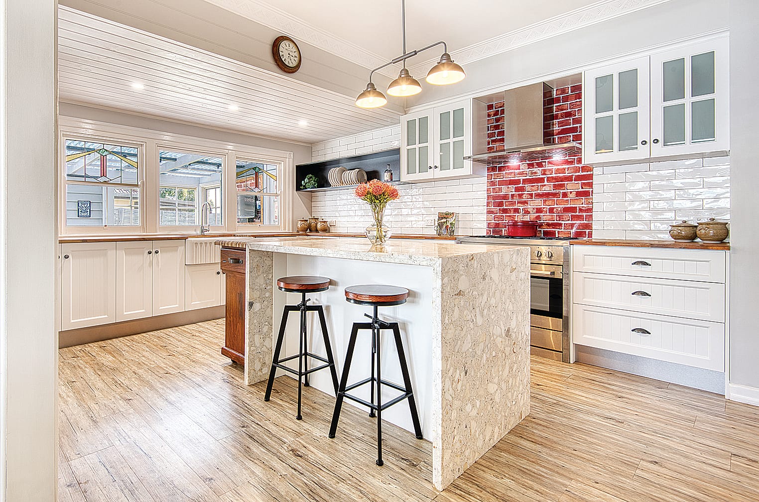 Double doors open on to the hero of the property with a magnificent kitchen featuring a beautiful marble island bench with loads of cupboard space, double butlers sink and a built-in pantry.
