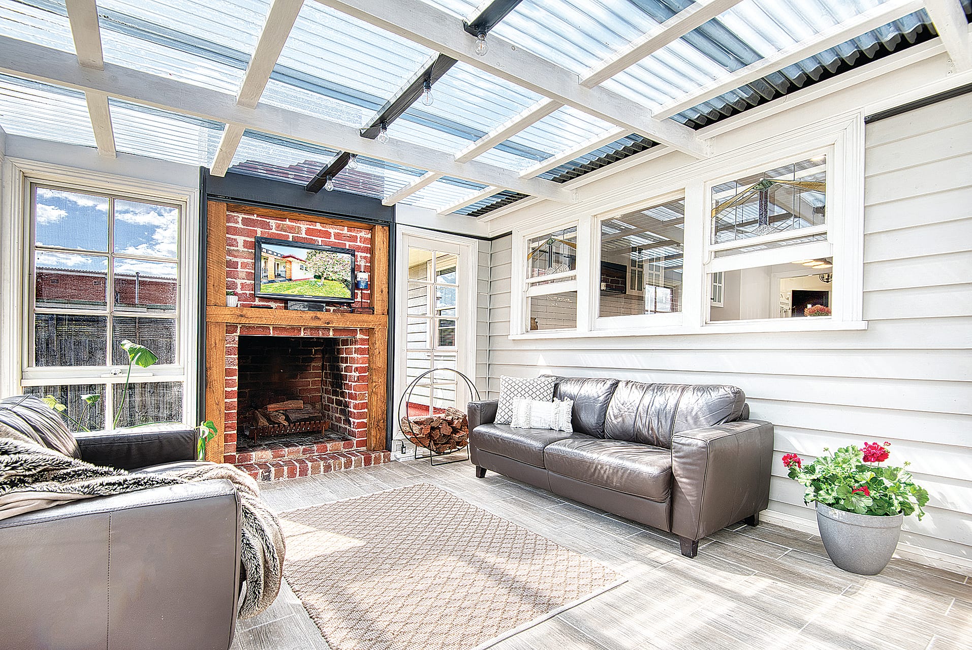 Other features include an enclosed outdoor area with a large open fireplace, small garden shed and two off-street parking spaces.
