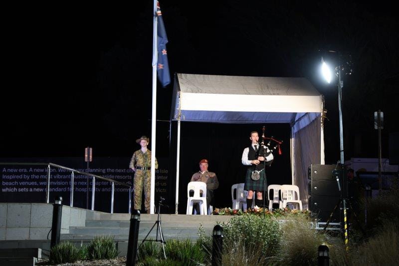 Former Newhaven College student Callum Fisher broke the silence with his bagpipes as the crowd gathered around with Phillip Island RSL President Chris Thompson welcoming the crowd, starting proceedings with a ‘welcome to country’.