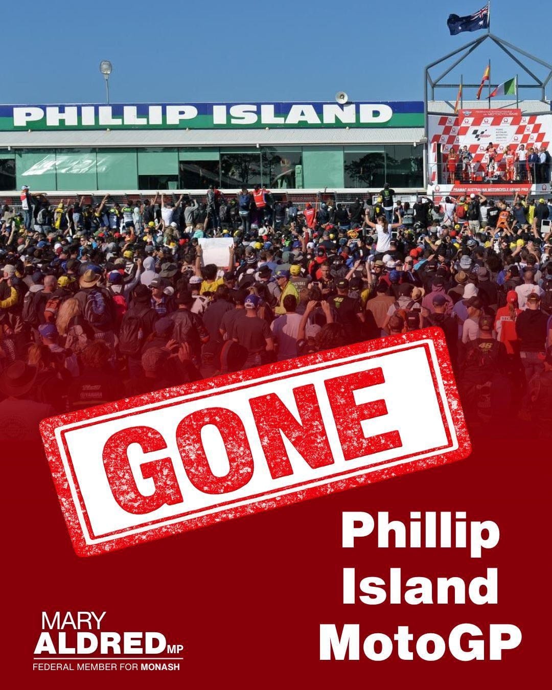 “Phillip Island has lost the Australian Motorcycle Grand Prix after hosting it since 1997. This is the reality of living in Jacinta Allan's Victoria, where investment is fleeing the state,” said Ms Aldred.