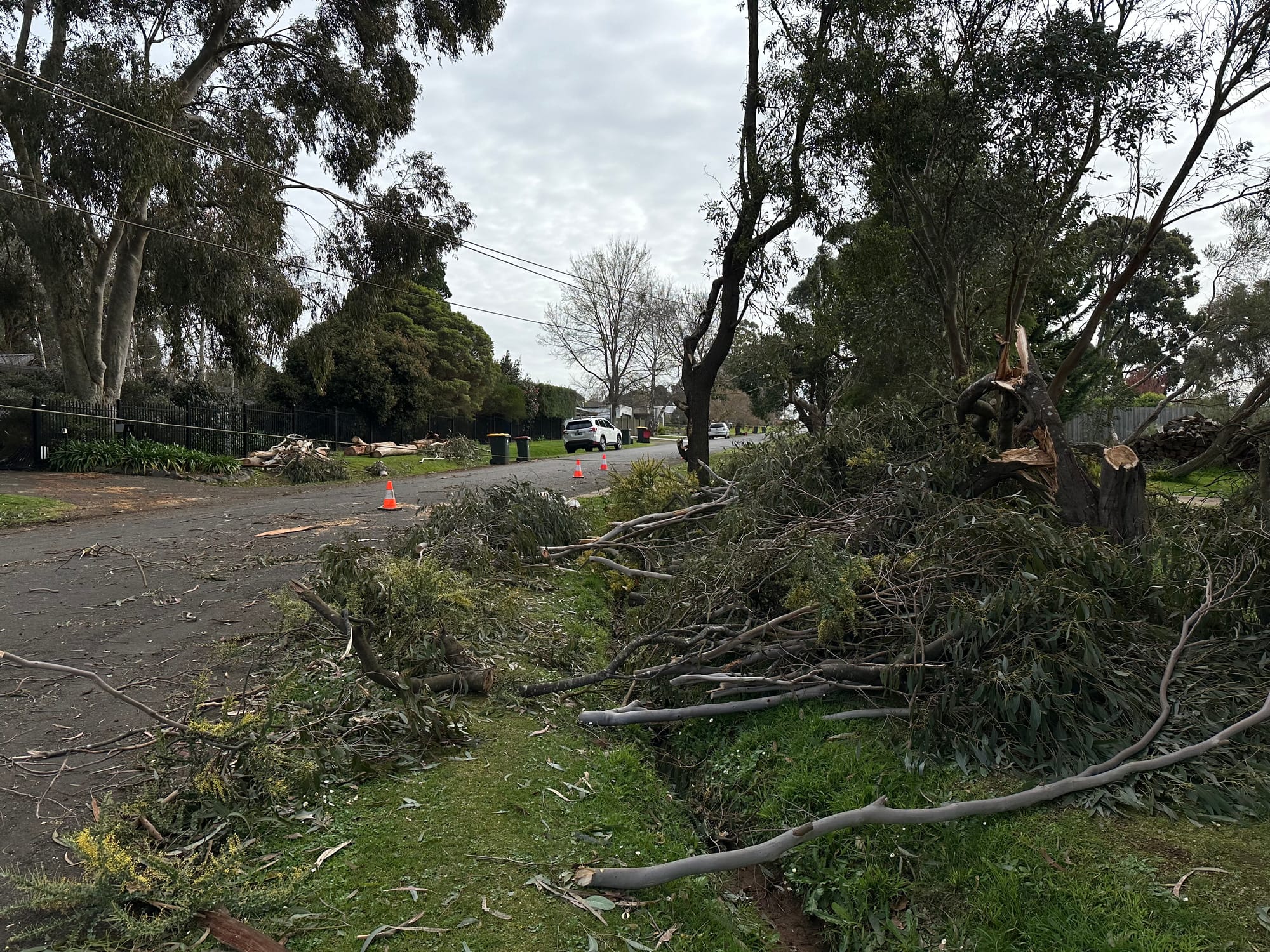 Louise Simon Court in Leongatha bore the brunt of the town’s power outage, with falling tree branches causing power lines to come down, one of which is still lying alongside the road and across driveways, with others hanging low.