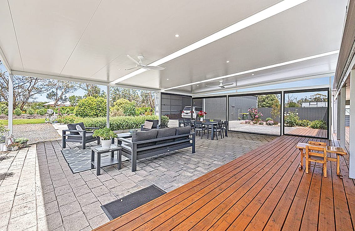The other side of the house offers a large undercover patio area, with transparent blinds allowing you to enjoy the space. Regardless of the season, you will find it hard to leave.