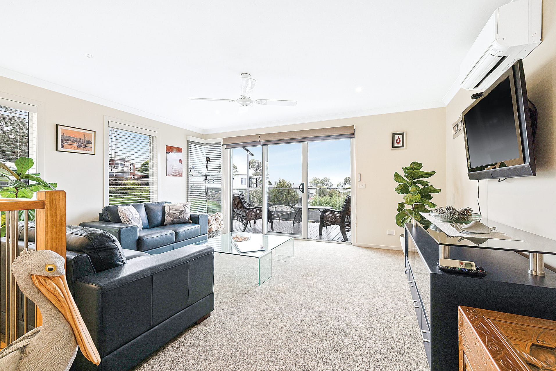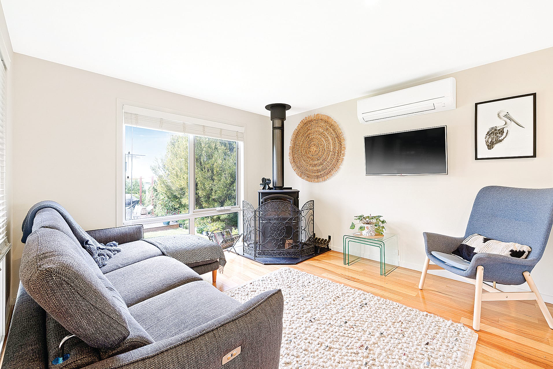 Upstairs we have three more spacious bedrooms, two with built in robes, ceiling fans and wall panel heaters, a family bathroom with bath and shower plus a second large living area that leads onto the balcony to take in a sweeping view of Westernport Bay. The balcony has an electric awning to provide shade and shelter in all conditions and creates the perfect spot for a cold drink on a warm evening.