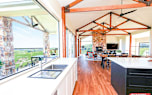 Crafted to harmonise with its natural surroundings, the residence showcases timeless materials and elegant finishes. Stone cladding features throughout, including a dramatic central fireplace that forms the heart of the home. Polished Australian hardwood floors add warmth and richness, while expansive glazing invites the outdoors in, flooding the interiors with natural light.