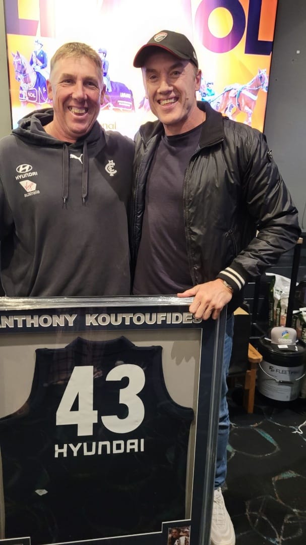 Former Carlton champion Anthony Koutoufides supported auctioneers Jimmy Kyle and Stuart Jenkin, and sold one of his framed Blues jumpers, signing it for local buyer Iain Riddell, who requested the price not be published.