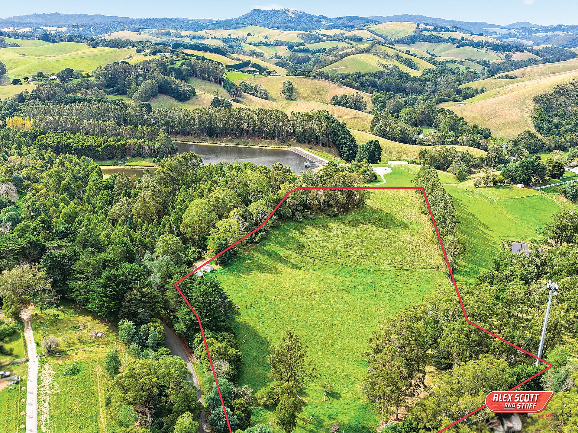 The home is positioned at the northern end of the property on top of the hill with a north facing aspect above the Foster reservoir and surrounded by native trees.