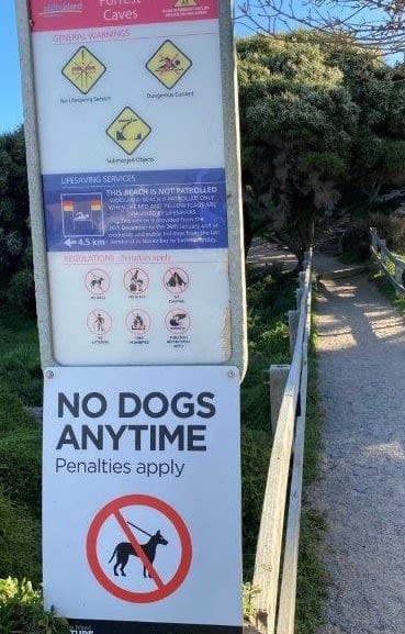 “There are currently two large permanent warning signs erected at the two entries to the Forrest Caves beach area. They carry the Australian Standards no-swimming symbol, and warn of no lifesaving service, dangerous current and submerged objects.