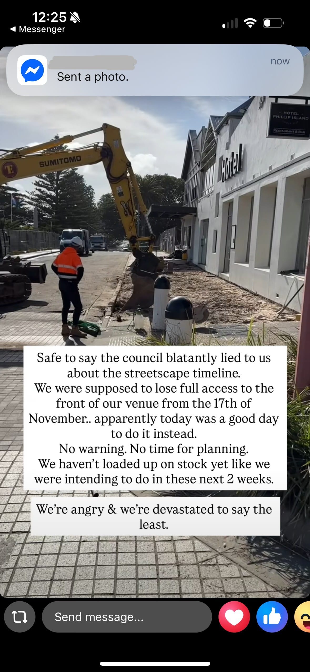 “We were supposed to lose full access to the front of our venue from the 17th of November… apparently today was a good day to do it instead. No warning. No time for planning. We haven’t loaded up on stock yet like we were intending to do in these two weeks… we’re devastated to say the least.”