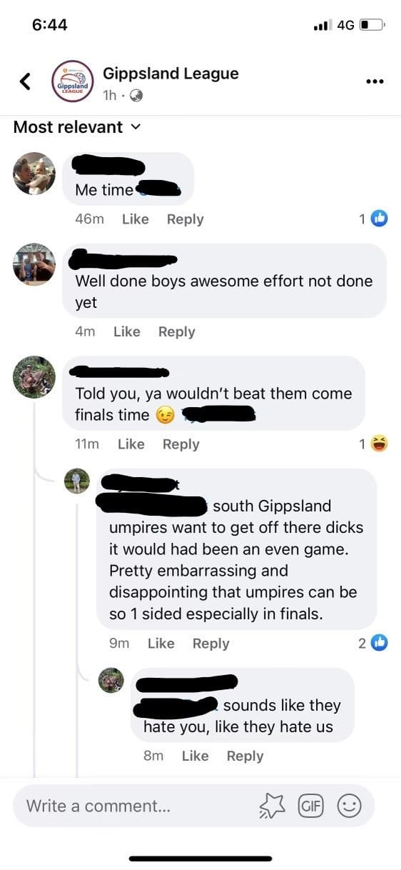 His comment received a sobering rebuke from another contributor to the Gippsland League Facebook page: “Time for you to grow up buddy.”