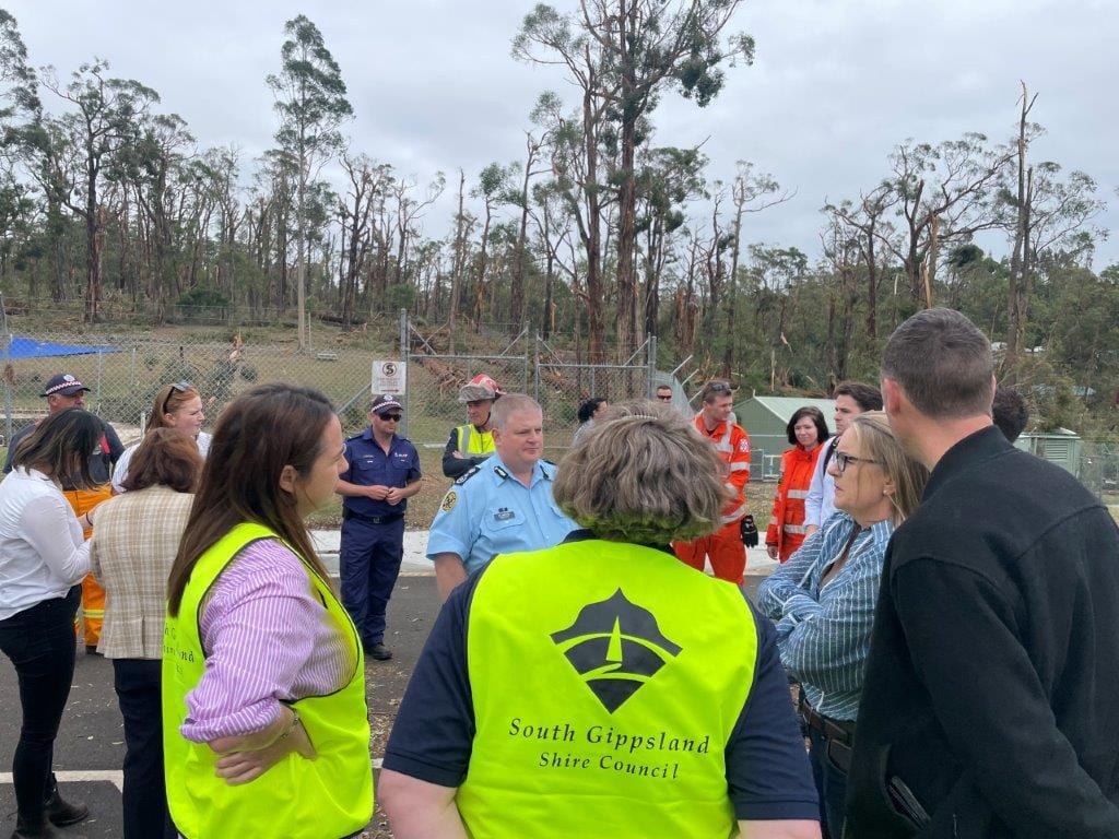 Ms Allan met with community and emergency services at the Mirboo North Fire Station at 10.30am today to receive a briefing of the damage caused when a cyclone-like storm cell cut a 1.5km swathe through the town in little over a minute last Tuesday afternoon.