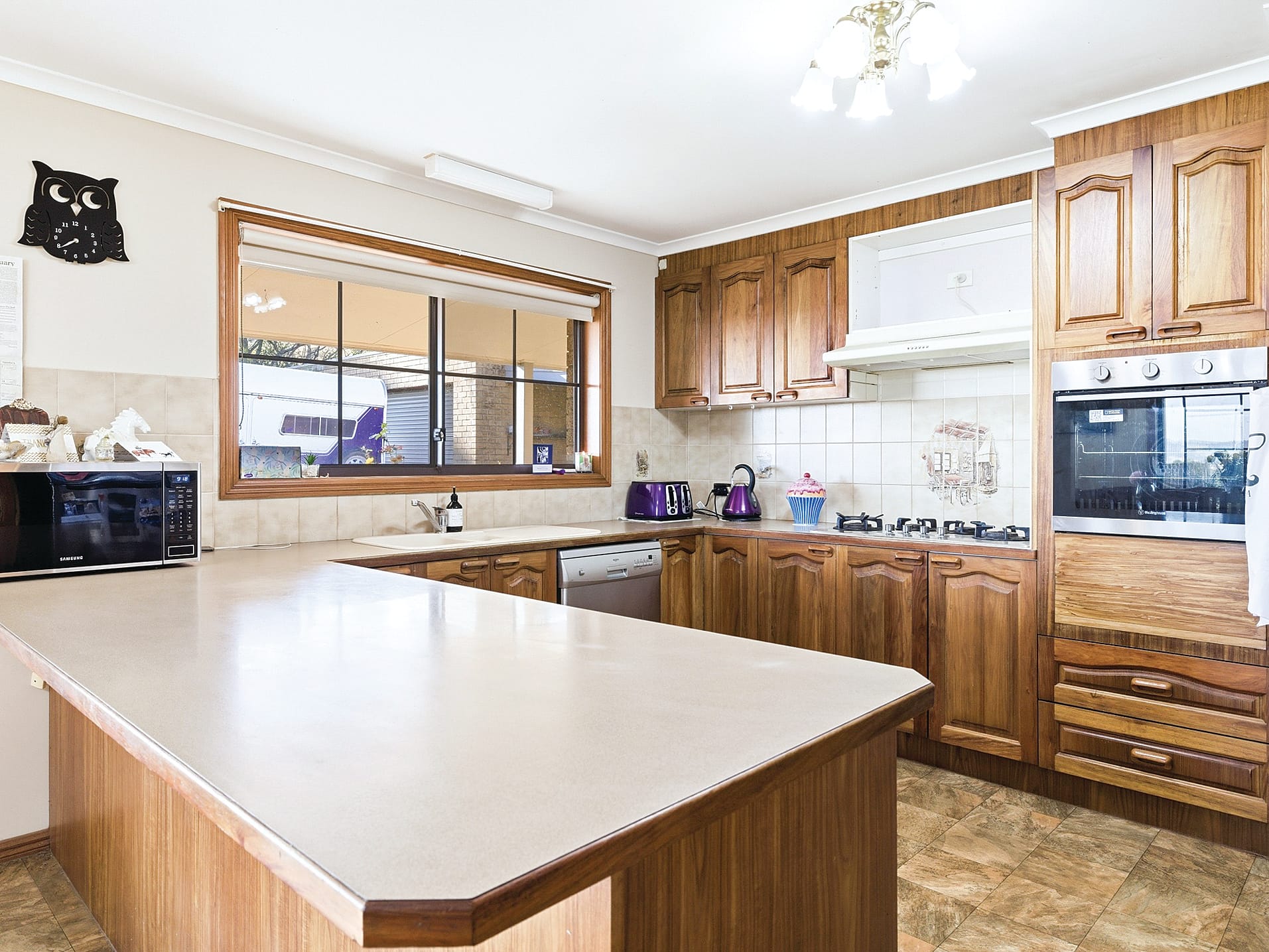 The spacious kitchen features a gas cooktop, electric wall oven, dishwasher and ample cupboard and bench space flowing through to the dining area.