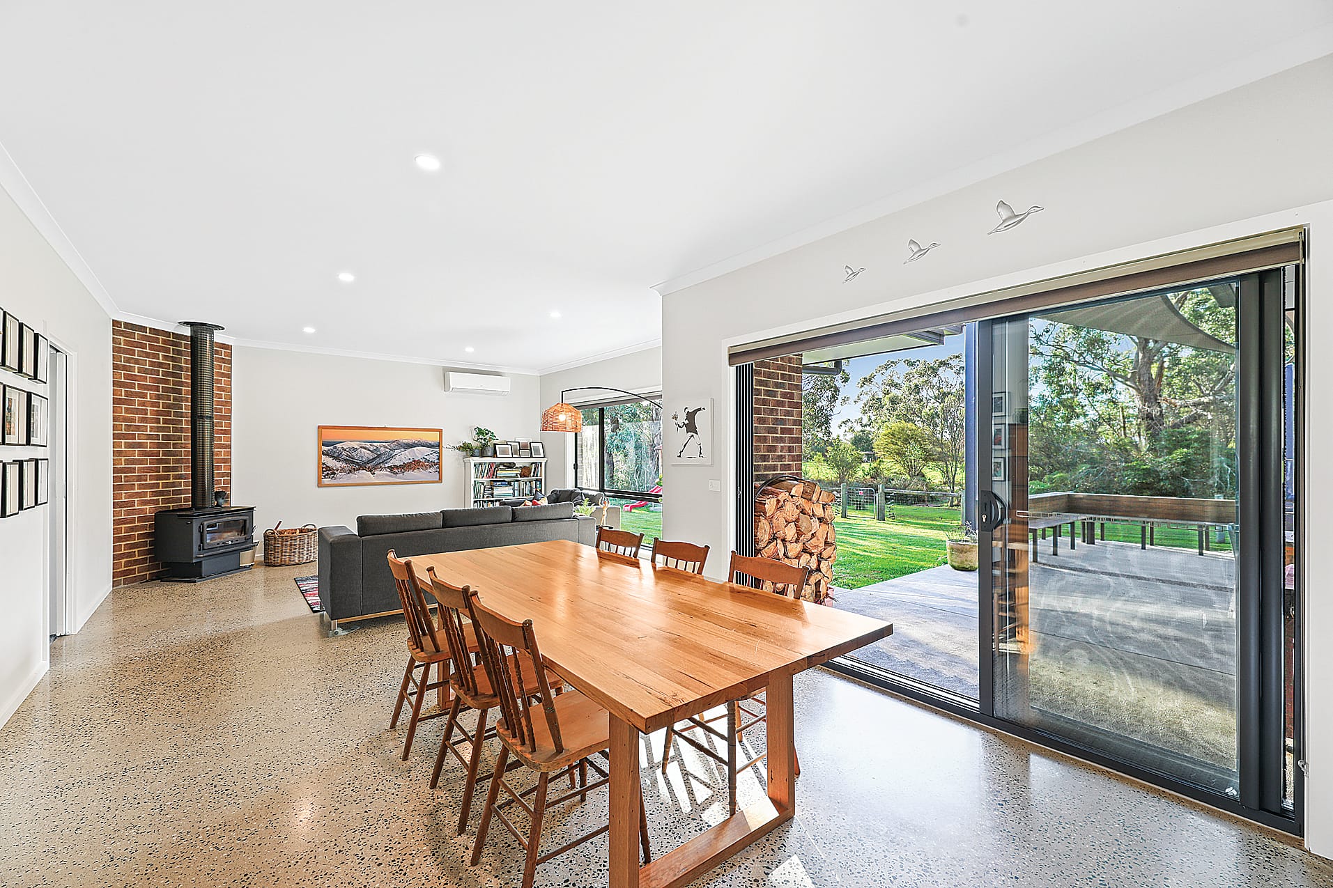 As you step inside, you will be greeted by a warm and inviting atmosphere. The open plan living and dining area is flooded with natural, north facing light, creating a bright and airy space for relaxation and entertaining. Equipped with a split system for hassle free heating and cooling, this property also offers the option to stay warm during the colder months with the wood fire or in the warmer months, you can open up the gorgeous stacker doors and embrace the alfresco area overlooking the yard and the adjoining Rail Trail.