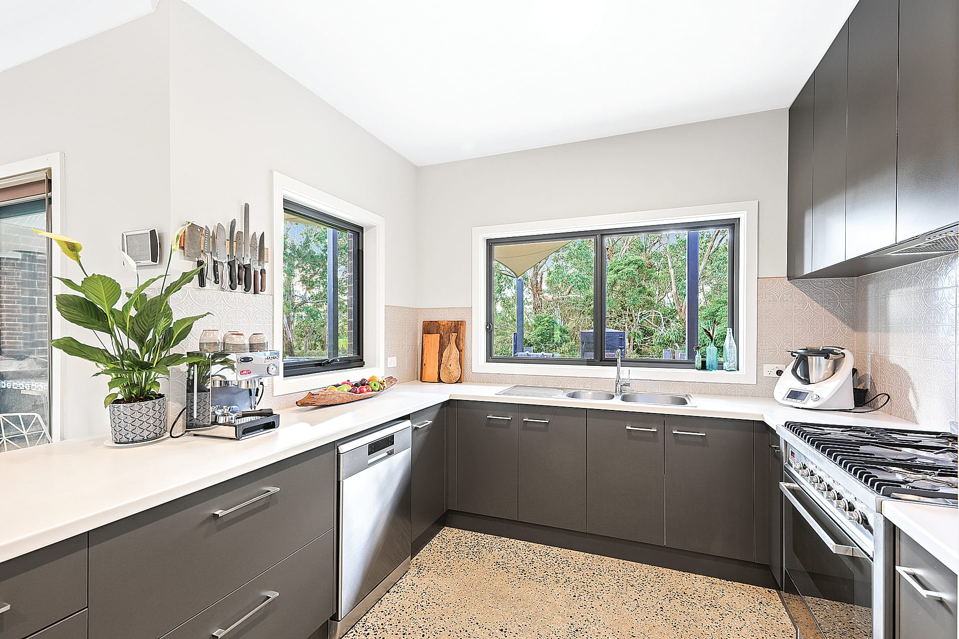 Features of the home boast a passive solar design to minimise heating and cooling demands, stunning polished concrete floors, double glazed windows, high ceilings, ceiling fans in all bedrooms, solar hot water, and quality fixtures and fittings throughout. The modern kitchen features sleek cabinetry, large breakfast bar, quality appliances, walk-in pantry and ample storage space.
