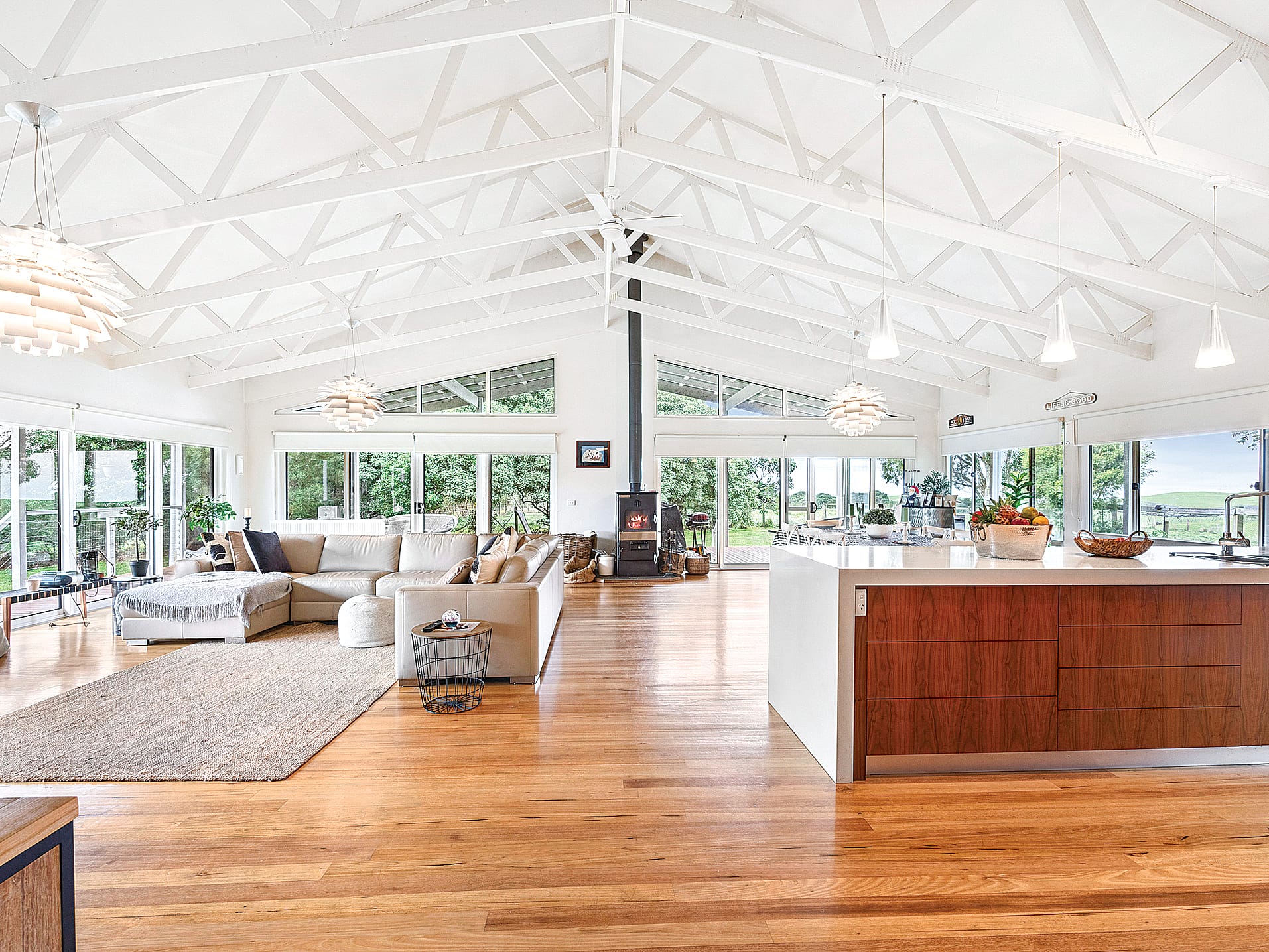 Step inside to the luxuriously appointed and expansive interior with soaring ceilings, abundant natural light, magnificent, polished timber flooring and a state of the art hydronic heating system, backed up with zoned reverse cycle air conditioning. Grand entrance foyer and wide hallway. The open plan living room, with exposed trusses and large areas of glazing, captures both the abundant natural light and delightful views. Doors open to a covered outdoor entertaining deck with glimpses of the Inlet and Wilsons Promontory. Superbly appointed kitchen with huge breakfast bar, integrated appliance cupboards and branded appliances. Separate home theatre room, the perfect space for family movie nights or to entertain guests. Four fitted bedrooms, the master suite adjoining an expansive ensuite. The stunning main bathroom features a frameless shower, freestanding bath tub, and separate w.c.